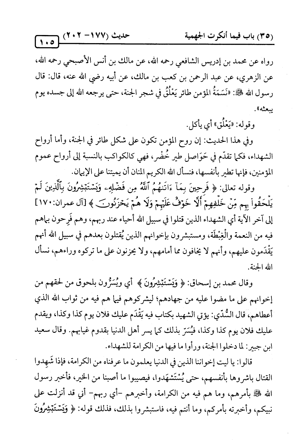 وفي هذا الحديث: إن روح المؤمن تكون على شكل طائر في الجنَّة، وأما أرواح الشهداء، فكما تقدّم في حَوَاصل طير خُضْر، فهي كالكواكب بالنسبة إلى أرواح عموم المؤمنين، فإنها تطير بأنفسها، فنسأل الله الكريم المنان أن يميتنا على الإيمان.