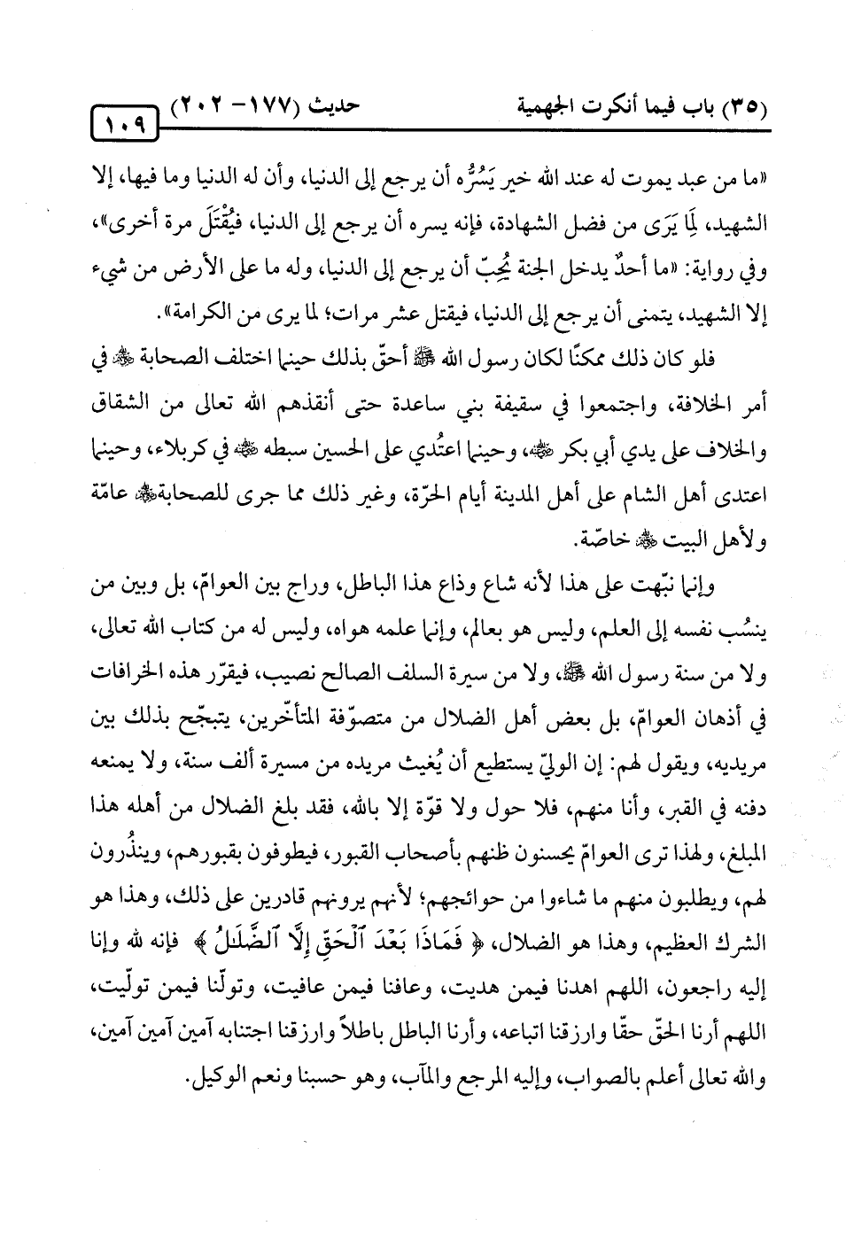 وإنّما نبّهت على هذا لأنه شاع وذاع هذا الباطل، وراج بين العوامّ، بل وبين من ينسُب نفسه إلى العلم، وليس هو بعالم، وإنما علمه هواه، وليس له من كتاب الله تعالى، ولا من سنة رسول الله -صلى الله عليه وسلم-، ولا من سيرة السلف الصالح نصيب، فيقرّر هذه الخرافات في أذهان العوامّ، بل بعض أهل الضلال من متصوّفة المتأخّرين، يتبجّح بذلك بين مريديه، ويقول لهم: إن الوليّ يستطيع أن يُغيث مريده من مسيرة ألف سنة، ولا يمنعه دفنه في القبر، وأنا منهم، فلا حول ولا قوّة إِلَّا بالله، فقد بلغ الضلال من أهله هذا المبلغ، ولهذا ترى العوامّ يحسنون ظنهم بأصحاب القبور، فيطوفون بقبورهم، وينذُرون لهم، ويطلبون منهم ما شاءوا من حوائجهم؛ لأنهم يرونهم قادرين على ذلك، وهذا هو الشرك العظيم، وهذا هو الضلال، {فَمَاذَا بَعْدَ الْحَقِّ إِلَّا الضَّلَالُ} فإنّه لله وإنا إليه راجعون، اللَّهُمَّ اهدنا فيمن هديت، وعافنا فيمن عافيت، وتولّنا فيمن تولّيت، اللَّهُمَّ أرنا الحقّ حقّا وارزقنا اتباعه، وأرنا الباطل باطلًا وارزقنا اجتنابه آمين آمين آمين، والله تعالى أعلم بالصواب، وإليه المرجع والمآب، وهو حسبنا ونعم الوكيل.