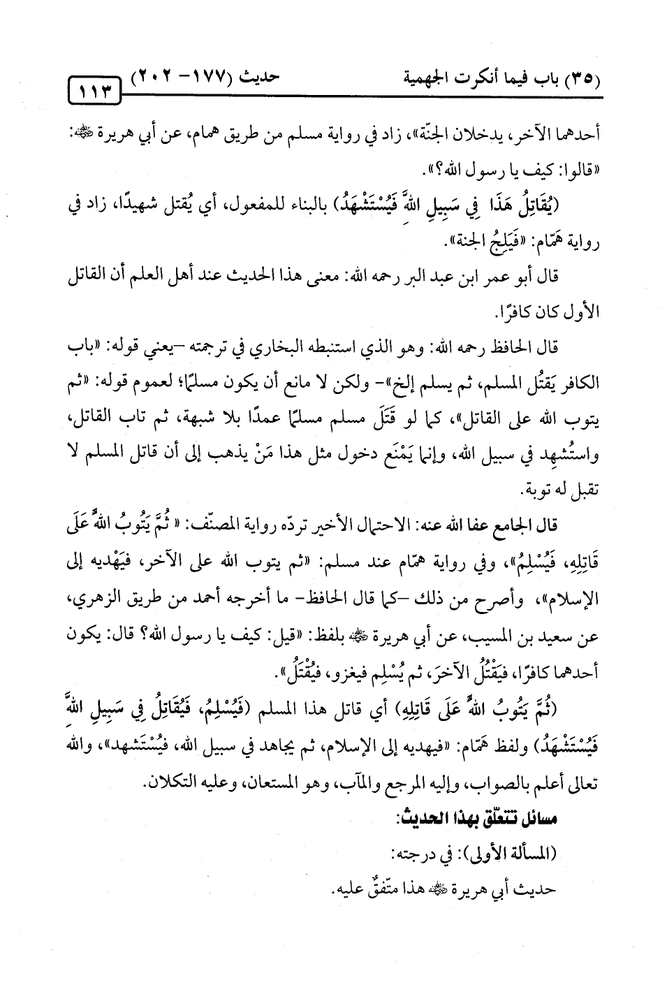 أحدهما الآخر، يدخلان الجنّة"، زاد في رواية مسلم من طريق همام، عن أبي هريرة -رضي الله عنه-: "قالوا: كيف يا رسول الله؟ ".