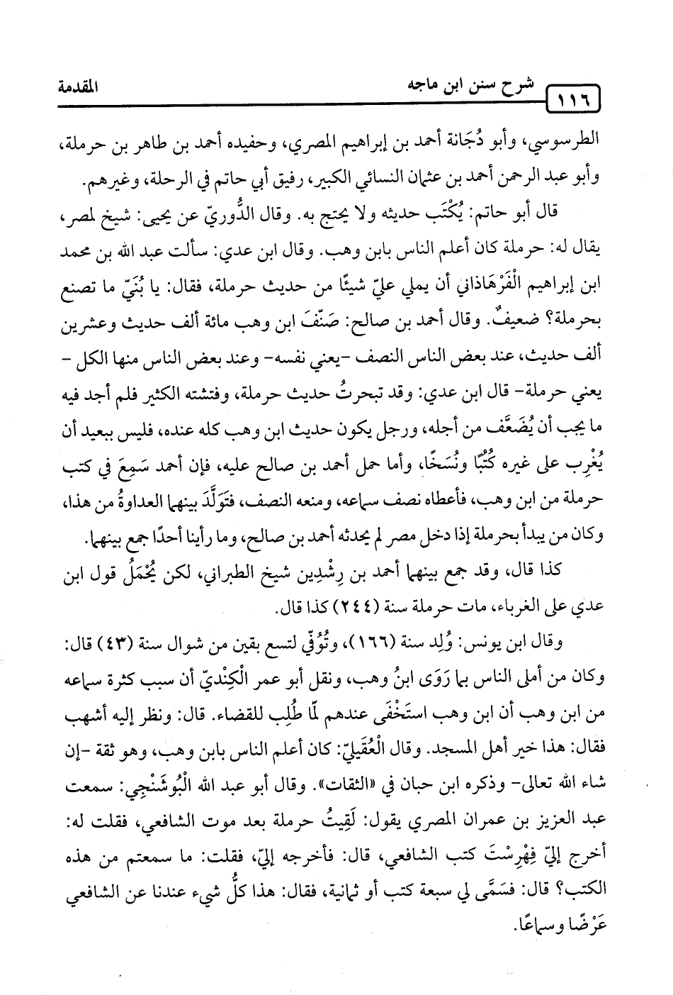 وقال: ابن يونس: وُلِد سنة (166)، وتُوُفّي لتسع بقين من شوال سنة (43) قال: وكان من أملى النَّاس بما رَوَى ابنُ وهب، ونقل أبو عمر الْكِنْديّ أن سبب كثرة سماعه من ابن وهب أن ابن وهب استَخْفَى عندهم لمّا طُلِب للقضاء. قال: ونظر إليه أشهب فقال: هذا خير أهل المسجد. وقال: الْعُقَيليّ: كان أعلم النَّاس بابن وهب، وهو ثقة -إن شاء الله تعالى- وذكره ابن حبّان في "الثِّقات". وقال: أبو عبد الله الْبُوشنْجِي: سمعت عبد العزيز بن عمران المصري يقول: لَقِيتُ حرملة بعد موت الشّافعيّ، فقلت له: أخرج إليّ فِهْرِسْتَ كتب الشّافعيّ، قال: فأخرجه إليّ، فقلت: ما سمعتم من هذه الكتب؟ قال: فسَمَّى لي سبعة كتب أو ثمانية، فقال: هذا كلُّ شيء عندنا عن الشّافعيّ عَرْضًا وسماعًا.