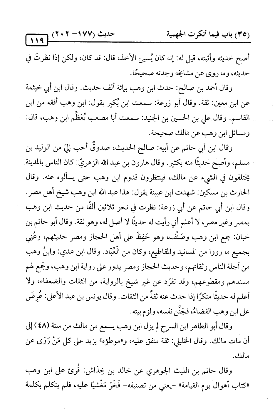 وقال أحمد بن صالح: حدث ابن وهب بمائة ألف حديث. وقال ابن أبي خيثمة عن ابن معين: ثقة. وقال أبو زرعة: سمعت ابن بُكير يقول: ابن وهب أفقه من ابن القاسم. وقال علي بن الحسين بن الجنيد: سمعت أبا مُصْعَب يُعَظِّم ابن وهب، قال: ومسائل ابن وهب عن مالك صحيحة.