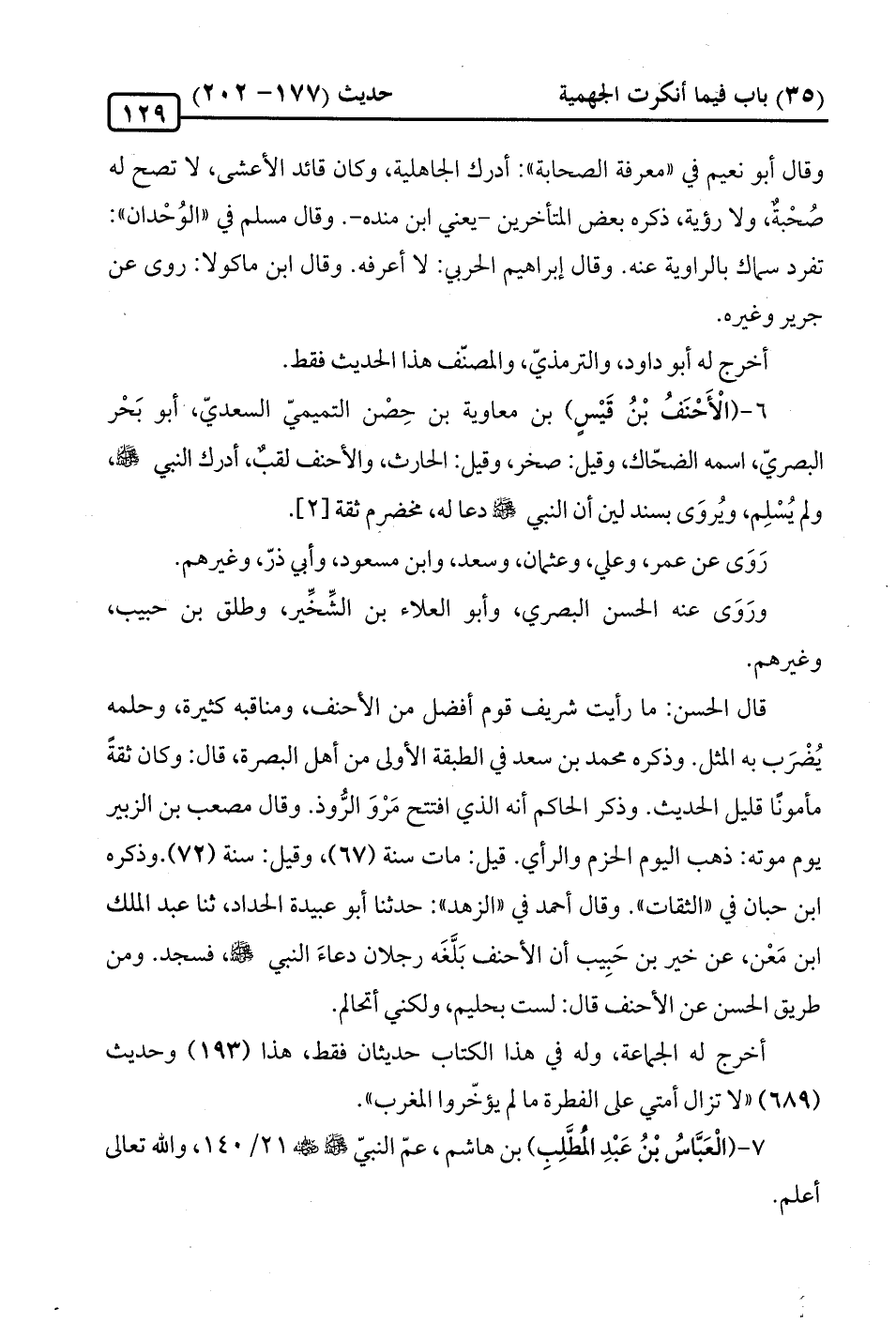 6 - (الْأَحْنَفُ بْنُ قَيْسٍ) بن معاوية بن حِصْن التميميّ السعديّ، أبو بَحْر البصريّ، اسمه الضحّاك، وقيل: صخر، وقيل: الحارث، والأحنف لقبٌ، أدرك النّبيّ -صلى الله عليه وسلم-، ولم يُسْلِم، ويُروَى بسند لين أن النّبيّ -صلى الله عليه وسلم- دعا له، مخضرم ثقة [2].