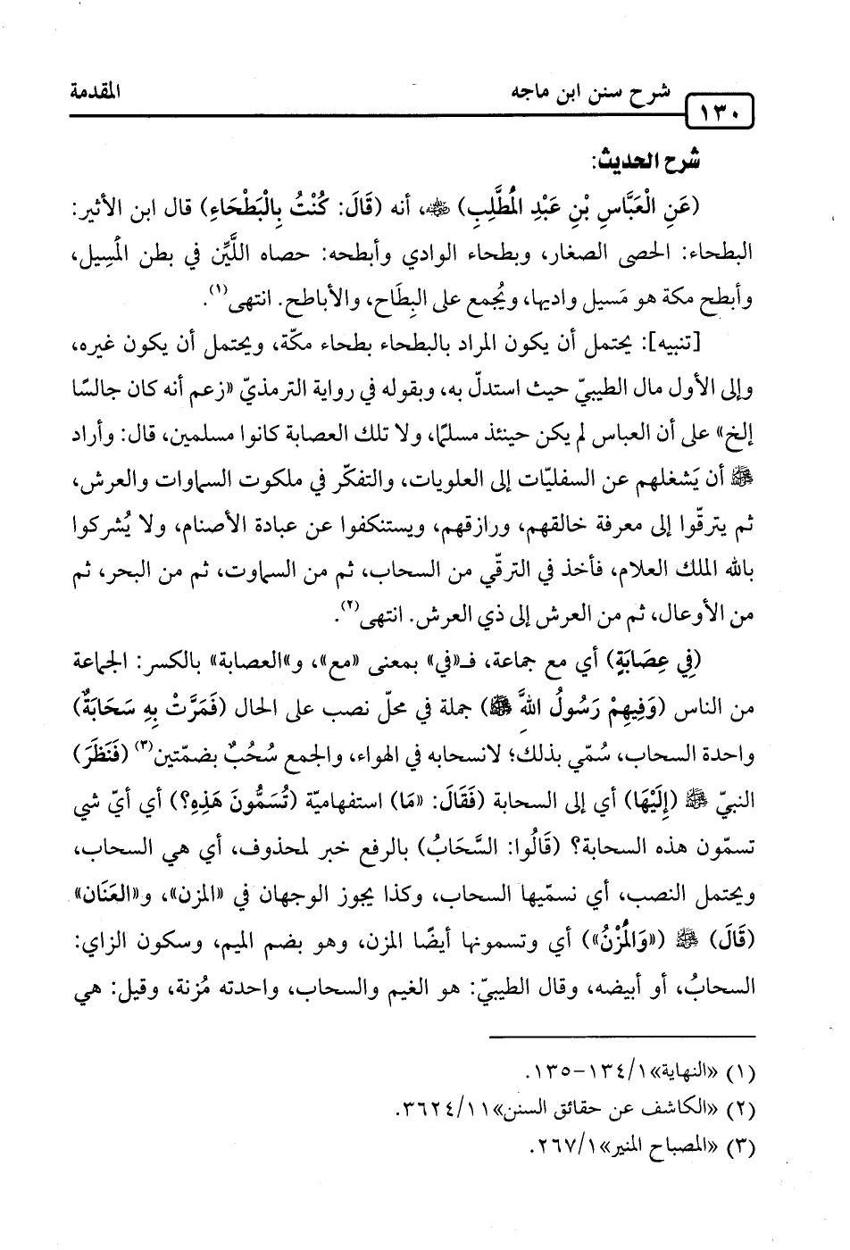 (عَنِ الْعَبَّاسِ بْنِ عَبْدِ المُطَّلِبِ) -رضي الله عنه-، أنه (قَالَ: كنْتُ بِالْبَطْحَاءِ) قال ابن الأثير: البطحاء: الحصى الصغار، وبطحاء الوادي وأبطحه: حصاه اللَّيِّن في بطن المَسِيل، وأبطح مكّة هو مَسيل واديها، ويُجمع على البِطَاح، والأباطح. انتهى (¬1).