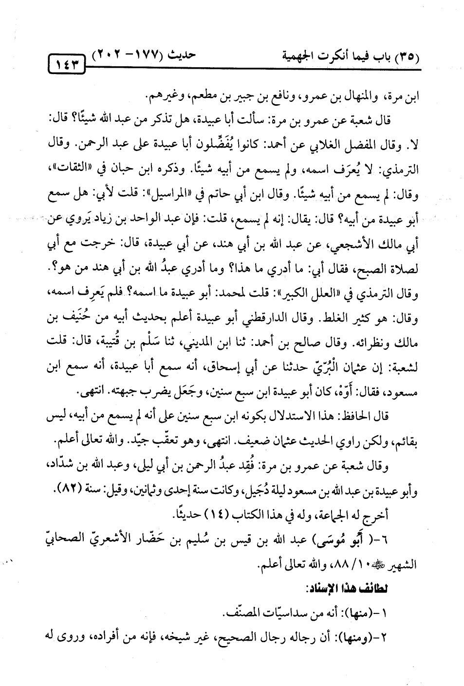 قال شعبة عن عمرو بن مرّة: سألت أبا عبيدة، هل تذكر من عبد الله شيئًا؟ قال: لا. وقال المفضل الغلابي عن أحمد: كانوا يُفَضِّلون أبا عبيدة على عبد الرّحمن. وقال التّرمذيّ: لا يُعرَف اسمه، ولم يسمع من أبيه شيئًا. وذكره ابن حبّان في "الثِّقات"، وقال: يسمع من أبيه شيئًا. وقال ابن أبي حاتم في "المراسيل": قلت لأبي: هل سمع أبو عبيدة من أبيه؟ قال: يقال: إنّه لم يسمع، قلت: فإن عبد الواحد بن زياد يَروي عن أبي مالك الأشجعي، عن عبد الله بن أبي هند، عن أبي عبيدة، قال: خرجت مع أبي لصلاة الصُّبح، فقال أبي: ما أدري ما هذا؟ وما أدري عبدُ الله بن أبي هند من هو؟. وقال التّرمذيّ في "العلل الكبير": قلت لمحمد: أبو عبيدة ما اسمه؟ فلم يَعرِف اسمه، وقال: هو كثير الغلط. وقال الدارقطني أبو عبيدة أعلم بحديث أبيه من حُنَيف بن مالك ونظرائه. وقال صالح بن أحمد: ثنا ابن المديني، ثنا سَلْم بن قُتيبة، قال: قلت لشعبة: إن عثمان الْبُرّيّ حَدَّثَنَا عن أبي إسحاق، أنه سمع أبا عبيدة، أنه سمع ابن مسعود، فقال: أَوّهْ، كان أبو عبيدة ابن سبع سنين، وجَعَل يضرب جبهته. انتهى.