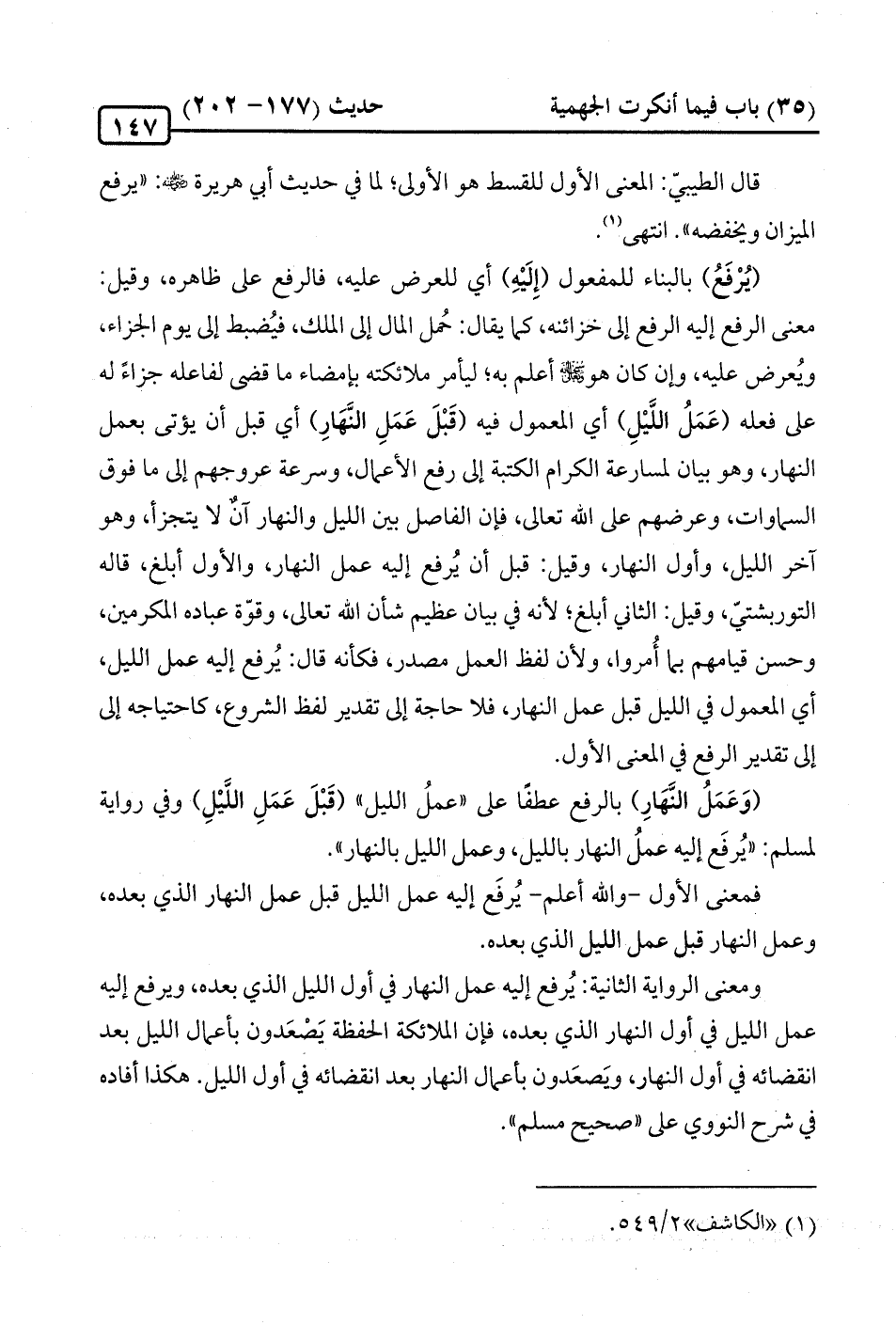 فمعنى الأوّل - والله أعلم - يُرفَع إليه عمل اللّيل قبل عمل النهار الّذي بعده، وعمل النهار قبل عمل اللّيل الّذي بعده.