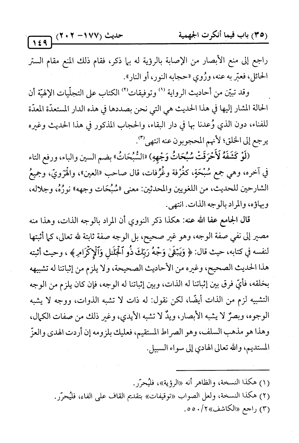 وقد تبيّن من أحاديث الرِّواية (¬1) وتوفيقات (¬2) الكتاب على التجلّيات الإلهيّة أن الحالة المشار إليها في هذا الحديث هي الّتي نحن بصددها في هذه الدَّار المستعدّة المعدّة للفناء، دون الّذي وُعدنا بها في دار البقاء، والحجاب المذكور في هذا الحديث وغيره يرجع إلى الخلق؛ لأنهم المحجوبون عنه انتهى (¬3).
