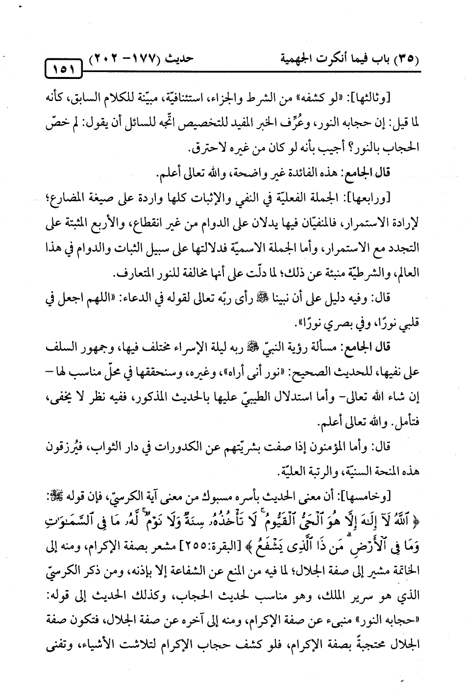 [وخامسها]: أن معنى الحديث بأسره مسبوك من معنى آية الكرسيّ، فإن قوله -سبحانه وتعالى-: {اللَّهُ لَا إِلَهَ إِلَّا هُوَ الْحَيُّ الْقَيُّومُ لَا تَأْخُذُهُ سِنَةٌ وَلَا نَوْمٌ لَهُ مَا في السَّمَاوَاتِ وَمَا في الْأَرْضِ مَنْ ذَا الَّذِي يَشْفَعُ} [البقرة: 255] مشعر بصفة الإكرام، ومنه إلى الخاتمة مشير إلى صفة الجلال؛ لما فيه من المنع عن الشفاعة إِلَّا بإذنه، ومن ذكر الكرسيّ الّذي هو سرير الملك، وهو مناسب لحديث الحجاب، وكذلك الحديث إلى قوله: "حجابه النور" منبىء عن صفة الإكرام، ومنه إلى آخره عن صفة الجلال، فتكون صفة الجلال محتجبةً بصفة الإكرام، فلو كشف حجاب الإكرام لتلاشت الأشياء، وتفنى