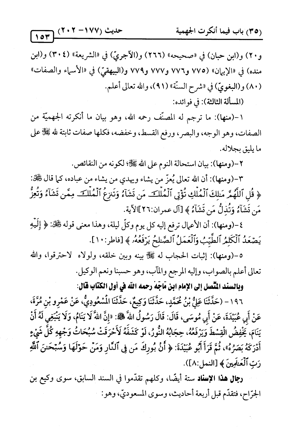 196 - (حَدَّثَنَا عِليُّ بْنُ مُحَمدٍ، حَدَّثَنَا وَكِيع، حدثنا المسْعُودِيُ، عَنْ عَمرِو بْنِ مُرَّةَ، عَنْ أَبِي عُبَيْدة، عَنْ أَبِي مُوسَى، قَالَ: قَالَ رَسُولُ الله - سبحانه وتعالى-: "إِنَّ الله لَا يَنَامُ، وَلَا يَنْبَغِي لَهُ أَنْ يَنَامَ، يَخْفِضُ الْقِسْطَ وَيَرفَعُهُ، حِجَابُهُ النُّورُ، لَوْ كَشَفهُ لَأَحْرَقَتْ سُبُحَاتُ وَجْهِهِ كُلَّ شَيْءٍ أَدرَكَهُ بَصَرُهِ"، ثُمَّ قَرَأَ أبو عُبَيْدة {أَنْ بُورِكَ مَنْ في النَّارِ وَمَنْ حَوْلَهَا وَسُبْحَانَ اللَّهِ رَبِّ الْعَالَمِينَ} [النمل: 8]).