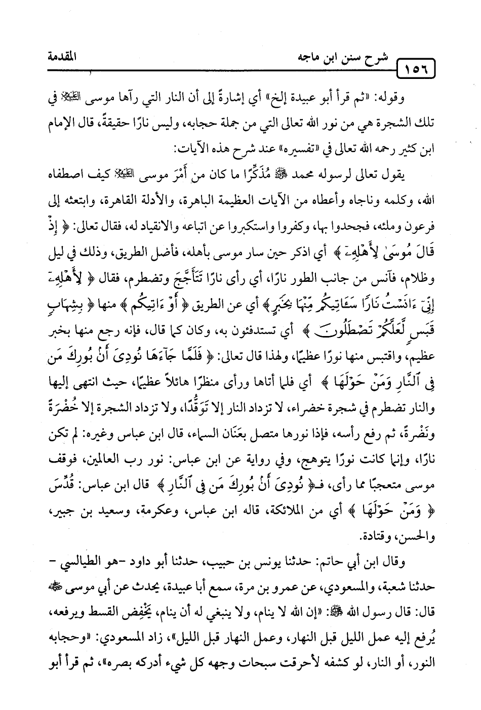 وقال ابن أبي حاتم: حدثنا يونس بن حبيب، حدثنا أبو داود -هو الطيالسي- حدثنا شعبة، والمسعودي، عن عمرو بن مرة، سمع أبا عبيدة، يحدث عن أبي موسى -رضي الله عنه- قال: قال رسول الله - صلى الله عليه وسلم -: "إن الله لا ينام، ولا ينبغي له أن ينام، يَخْفِض القسط ويرفعه، يُرفع إليه عمل الليل قبل النهار، وعمل النهار قبل الليل"، زاد المسعودي: "وحجابه النور، أو النار، لو كشفه لأحرقت سبحات وجهه كل شيء أدركه بصره"، ثم قرأ أبو