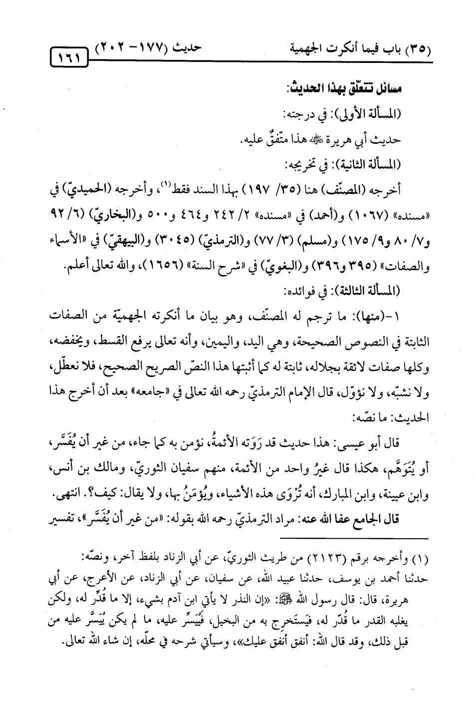 قال أبو عيسى: هذا حديث قد رَوَته الأئمةُ، نؤمن به كما جاء، من غير أن يُفَسَّر، أو يُتَوَهَّم، هكذا قال غيرُ واحد من الأئمة، منهم سفيان الثوريّ، ومالك بن أنس، وابن عيينة، وابن المبارك، أنه تُرْوَى هذه الأشياء، ويُؤمَنُ بها، ولا يقال: كيف؟. انتهى.