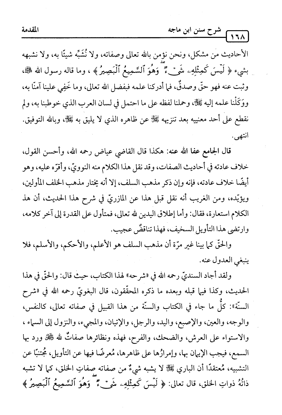 ولقد أجاد السنديّ رحمه الله في "شرحه" لهذا الكتاب، حيث قال: والحقّ في هذا الحديث، وكذا فيما قبله وبعده ما ذكره المحقّقون، قال البغويّ رحمه الله في "شرح السنّة": كلُّ ما جاء في الكتاب والسنّة من هذا القبيل في صفاته تعالى، كالنفس، والوجه، والعين، والإصبع، واليد، والرجل، والإتيان، والمجيء، والنزول إلى السماء، والاستواء على العرش، والضحك، والفرح، فهذه ونظائرها صفاتٌ لله - عز وجل - ورد بها السمع، فيجب الإيمان بها، وإمرارُها على ظاهرها، مُعرضًا فيها عن التأويل، مجُتنبًا عن التشبيه، مُعتقدًا أن الباري -سبحانه وتعالى- لا يشبه شيءٌ من صفاته صفاتِ الخلق، كما لا تشبه ذاتُهُ ذواتِ الخلق، قال تعالى: {لَيْسَ كَمِثْلِهِ شَيْءٌ وَهُوَ السَّمِيعُ الْبَصِيرُ}