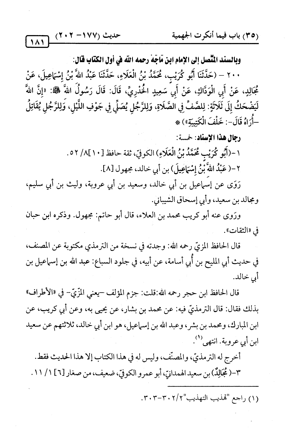 200 - (حَدَّثَنَا أبو كُرَيْبٍ، مُحَمَّدُ بْنُ الْعَلَاءِ، حدثنا عَبْدُ الله بْنُ إِسماعِيلَ، عَنْ مُجَالِدٍ، عَنْ أَبِي الْوَدَّاكِ، عَنْ أَبِي سَعِيدٍ الخدرِيِّ، قَالَ: قَالَ رَسُولُ اللهِ -صلى الله عليه وسلم-: "إِنَّ الله لَيَضْحَكُ إِلَى ثَلَاثَةٍ: لِلصَّفِّ في الصَّلَاةِ، وَللرَّجُلِ يُصَلِّي في جَوْفِ اللَّيْلِ، وَللرَّجُلِ يُقَاتِلُ -أُرَاهُ قَالَ-: خَلْفَ الْكَتِيبةِ") *