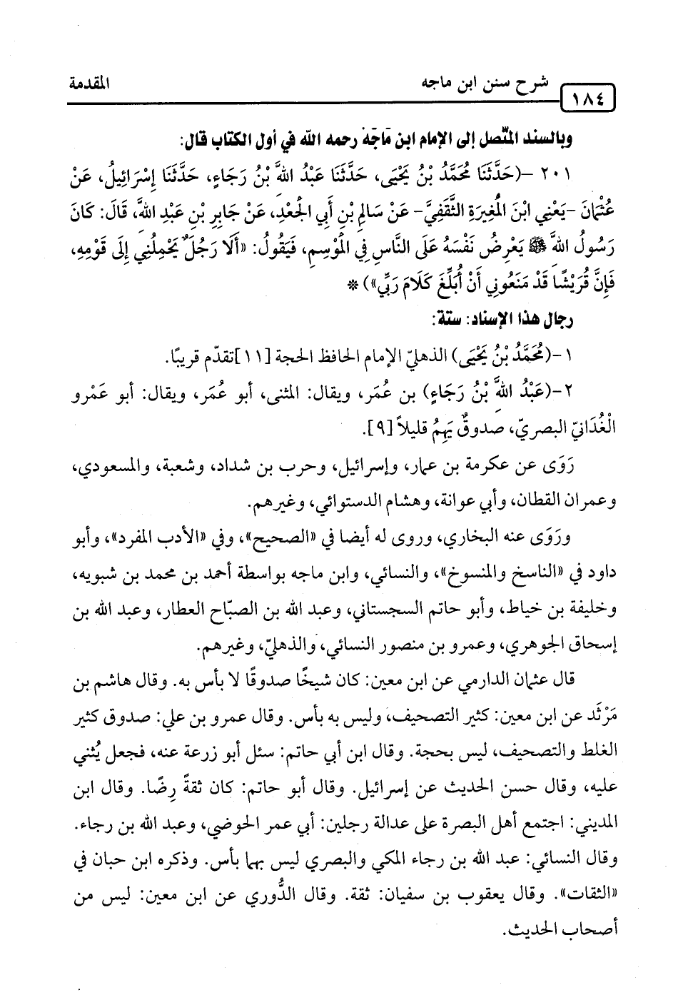 201 - (حَدَّثَنَا مُحَمَّدُ بْنُ يَحيَى، حَدَّثَنَا عَبْدُ الله بْنُ رَجَاءٍ، حَدَّثَنَا إِسْرَائِيلُ، عَنْ عُثمانَ -يَعني ابْنَ المغِيرَةِ الثَّقَفِي- عَنْ سَالم بْنِ أَبِي الجعدِ، عَنْ جَابِرِ بْنِ عَبْدِ الله، قَالَ: كَانَ رَسُولُ الله -صلى الله عليه وسلم- يعرِضُ نَفْسَهُ عَلَى النَّاسِ في الموْسِمِ، فَيَقُولُ: "أَلا رَجُل يَحمِلُنيَ إِلَى قَوْمِهِ، فَإِنَّ قُرَيْشًاَ قَدْ مَنَعُونِي أَنْ أبلِّغَ كلَامَ رَبِّي") *