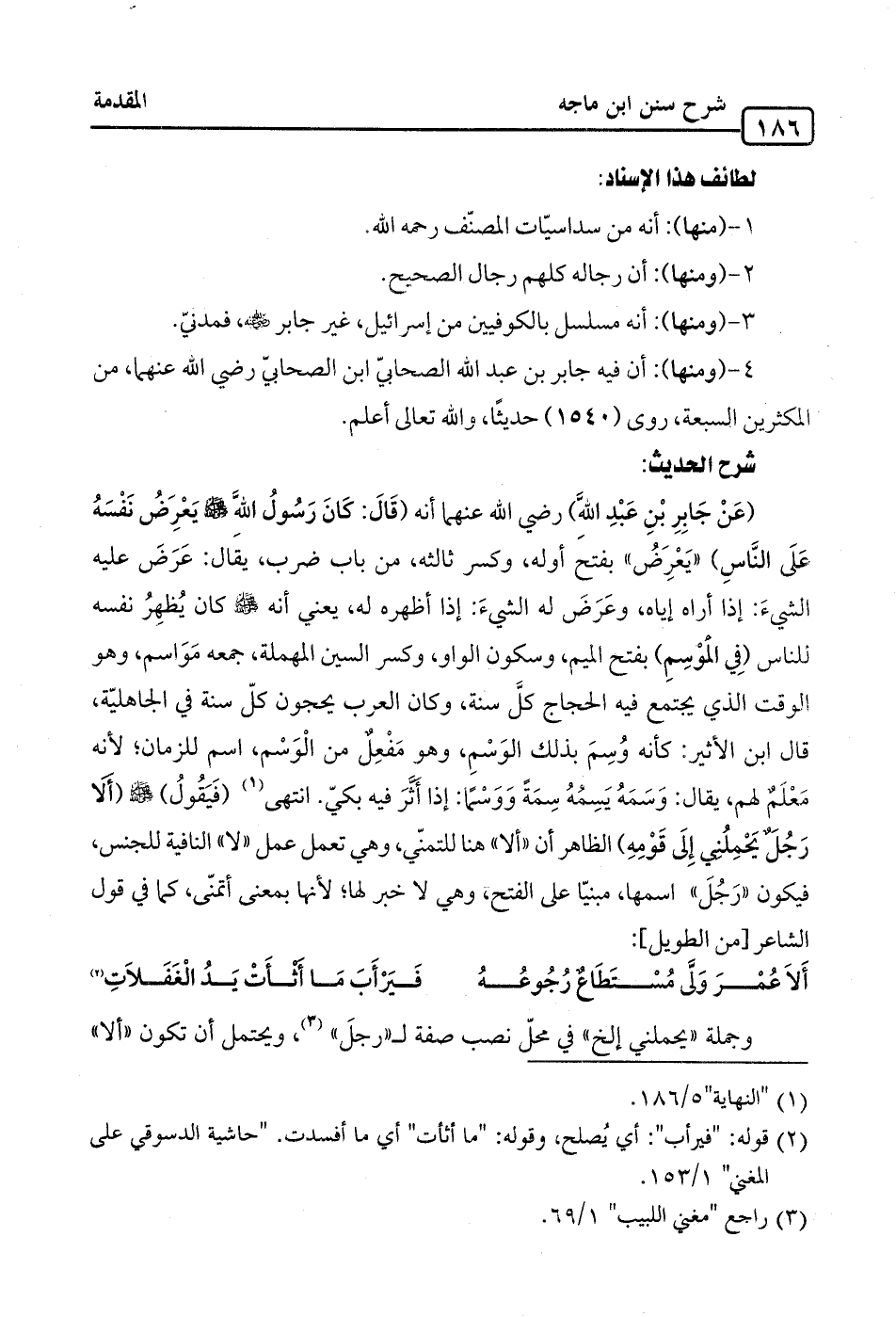 (عَنْ جَابِرِ بنِ عَبْدِ الله) رضي الله عنهما أنه (قالَ: كَانَ رَسُولُ الله -صلى الله عليه وسلم- يَعرَضُ نَفْسَهُ علَى النَّاسِ) "يَعرِضُ" بفتح أوله، وكسر ثالثه، من باب ضرب، يقَال: عَرَضَ عليه الشيءَ: إذا أراه إياه، وعَرَضَ له الشيءَ: إذا أظهره له، يعني أنه -صلى الله عليه وسلم- كان يُظهِرُ نفسه للناس (في الموْسِمِ) بفتح الميم، وسكون الواو، وكسر السين المهملة، جمعه مَوَاسم، وهو الوقت الذي يجتمع فيه الحجاج كلَّ سنة، وكان العرب يحجون كلّ سنة في الجاهليّة، قال ابن الأثير: كأنه وُسِمَ بذلك الوَسْمِ، وهو مَفعِلٌ من الْوَسْم، اسم للزمان؛ لأنه معلمٌ لهم، يقال: وَسَمَهُ يَسِمُهُ سِمَةً وَوَسْمًا: إذا أثَّرَ فيه بكيّ. انتهى (¬1) (فَيَقُولُ) -صلى الله عليه وسلم- (أَلا رَجُلٌ يحمِلُني إِلَى قوْمِهِ) الظاهر أن "ألا" هنا للتمنّي، وهي تعمل عمل "لا" النافية للجنس، فيكون "رَجُلَ" اسمها، مبنيّا على الفتح، وهي لا خبر لها؛ لأنها بمعنى أتمنّى، كما في قول الشاعر [من الطويل]:
