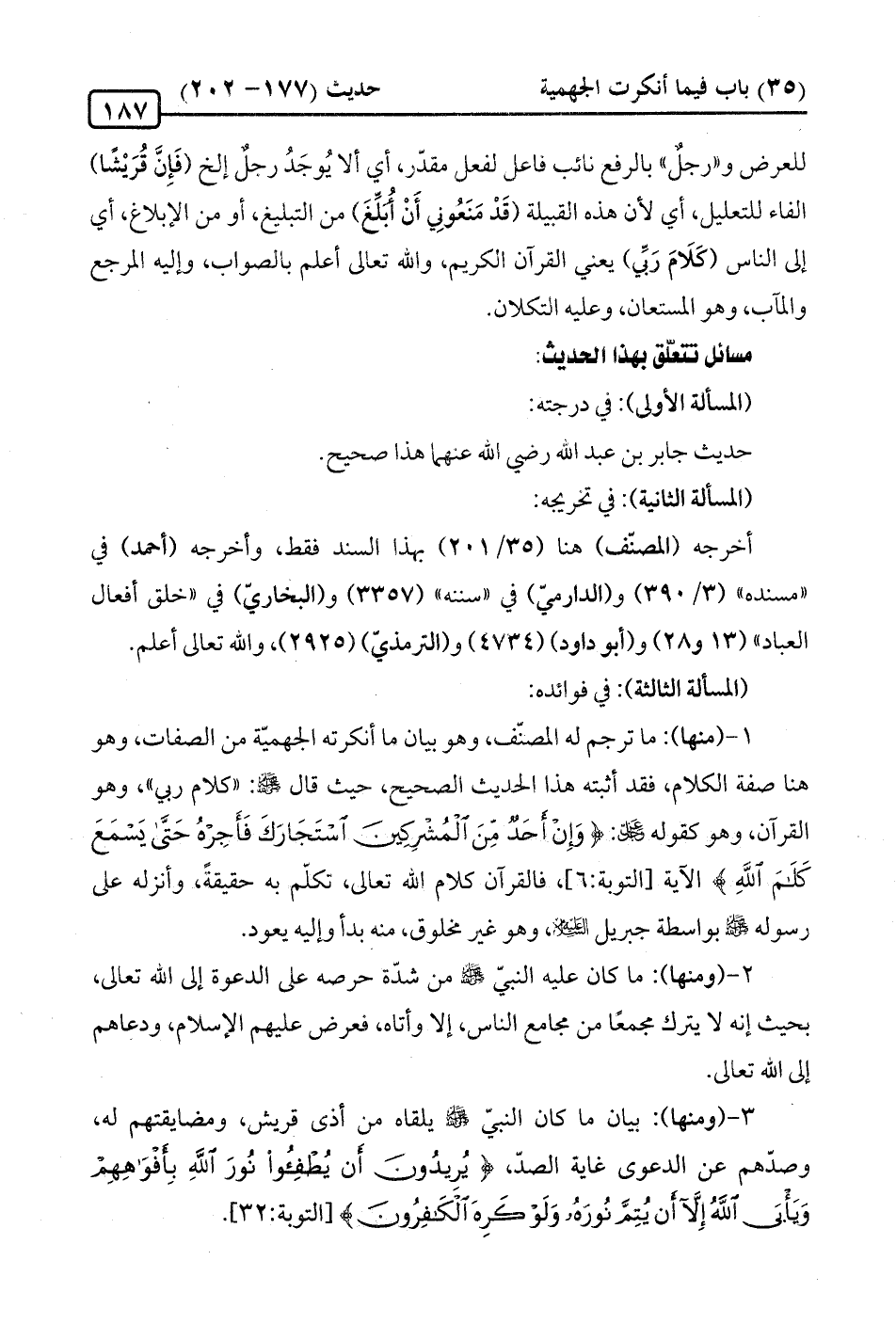 1 - (منها): ما ترجم له المصنف، وهو بيان ما أنكرته الجهميّة من الصفات، وهو هنا صفة الكلام، فقد أثبته هذا الحديث الصحيح، حيث قال -صلى الله عليه وسلم-: "كلام ربي"، وهو القرآن، وهو كقوله - عز وجل -: {وَإِنْ أَحَدٌ مِنَ الْمُشْرِكِينَ اسْتَجَارَكَ فَأَجِرْهُ حَتَّى يَسْمَعَ كَلَامَ اللَّهِ} [التوبة: 6]، فالقرآن كلام الله تعالى، تكلام به حقيقةً، وأنزله على رسوله -صلى الله عليه وسلم- بواسطة جبريل - عليه السلام -، وهو غير مخلوق، منه بدأ وإليه يعود.