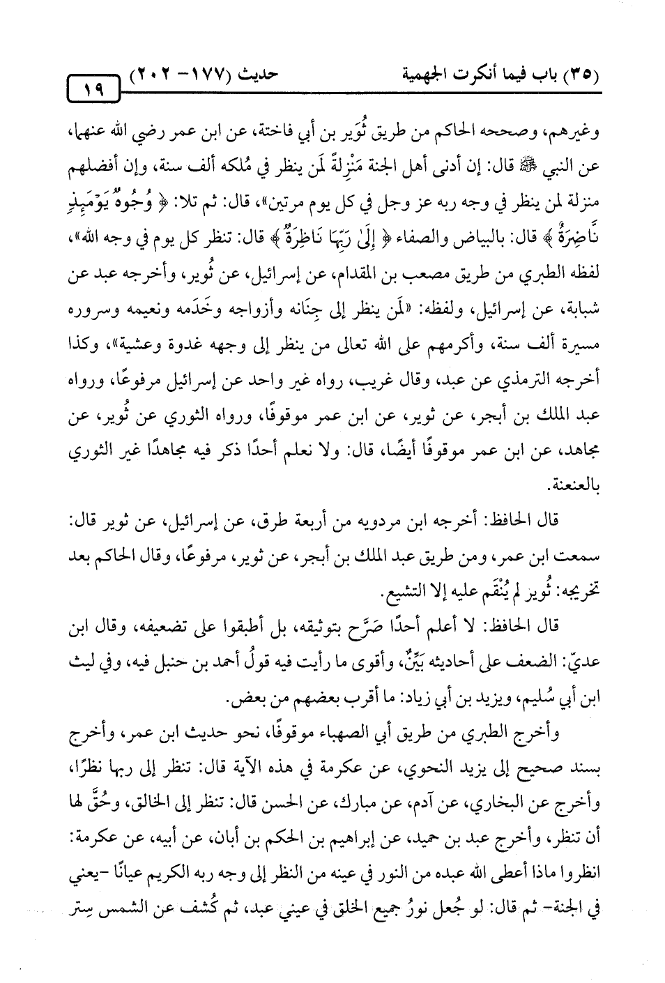 وغيرهم، وصححه الحاكم من طريق ثُوَير بن أبي فاختة، عن ابن عمر رضي الله عنهما، عن النّبيّ -صلى الله عليه وسلم- قال: إن أدنى أهل الجنَّة مَنْزِلة لمَن ينظر في مُلكه ألف سنة، وإن أفضلهم منزلة لمن ينظر في وجه ربه -عَزَّ وَجَلَّ- في كلّ يوم مرتين"، قال: ثمّ تلا: {وُجُوهٌ يَوْمَئِذٍ نَاضِرَةٌ} قال: بالبياض والصفاء {إِلَى رَبِّهَا نَاظِرَةٌ} قال: تنظر كلّ يوم في وجه الله"، لفظه الطّبريّ من طريق مُصْعَب بن المقدام، عن إسرائيل، عن ثُوير، وأخرجه عبد عن شبابة، عن إسرائيل، ولفظه: "لمَن ينظر إلى جِنَانه وأزواجه وخَدَمه ونعيمه وسروره مسيرة ألف سنة، وأكرمهم على الله تعالى من ينظر إلى وجهه غدوة وعشية"، وكذا أخرجه الترمذي عن عبد، وقال غريب، رواه غير واحد عن إسرائيل مرفوعًا، ورواه عبد الملك بن أبجر، عن ثوير، عن ابن عمر موقوفًا، ورواه الثّوريّ عن ثُوير، عن مجاهد، عن ابن عمر موقوفًا أيضًا، قال: ولا نعلم أحدًا ذكر فيه مجاهدًا غير الثّوريّ بالعنعنة.
