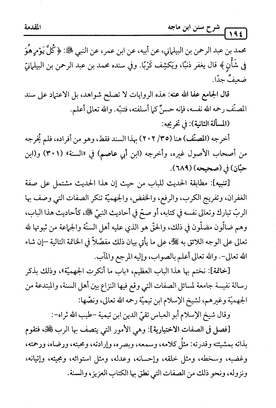 [خاتمة]: نختم بها هذا الباب العظيم، "باب ما أنكرت الجهميّة"، وذلك بذكر رسالة نفيسة جامعة لمسائل الصفات التي وقع فيها النزاع بين أهل السنة، والمبتدعة من الجهميّة وغيرهم، لشيخ الإسلام ابن تيميّة رحمه الله تعالى، ونصّها: