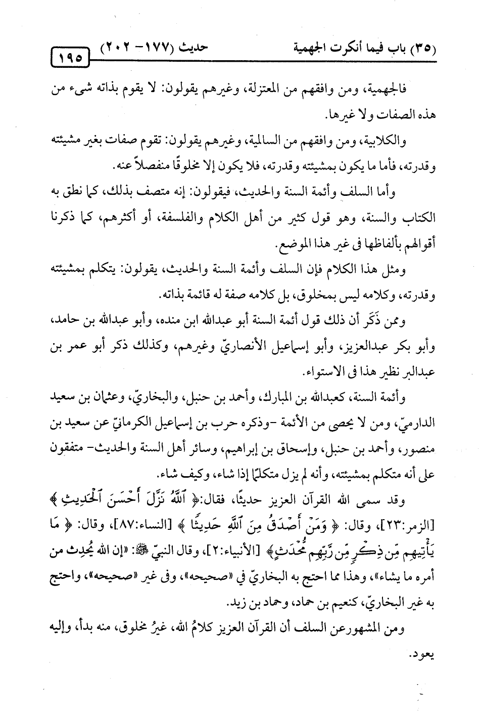 وقد سمى الله القرآن العزيز حديثًا، فقال: {اللَّهُ نَزَّلَ أَحْسَنَ الْحَدِيثِ} [الزمر: 23]، وقال: {وَمَنْ أَصْدَقُ مِنَ اللَّهِ حَدِيثًا} [النساء: 87]، وقال: {مَا يَأْتِيهِمْ مِنْ ذِكْرٍ مِنْ رَبِّهِمْ مُحْدَثٍ} [الأنبياء: 2]، وقال النبيّ -صلى الله عليه وسلم-: "إن الله يُحدِث من أمره ما يشاء"، وهذا مما احتج به البخاريّ في "صحيحه"، وفى غير "صحيحه"، واحتج به غير البخاري، كنعيم بن حماد، وحماد بن زيد.