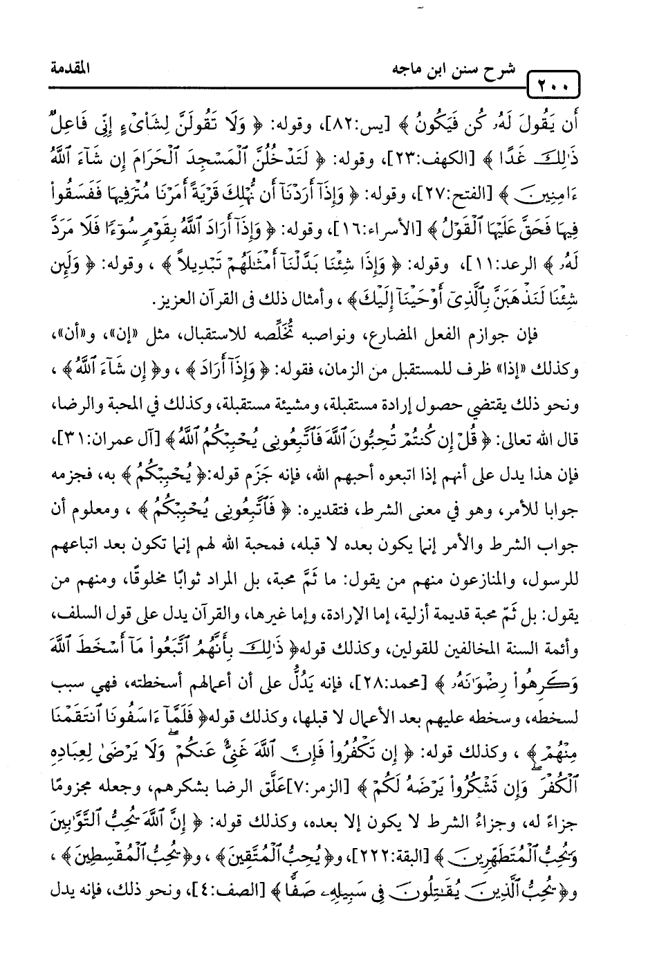 فإن جوازم الفعل المضارع، ونواصبه تُخَلِّصه للاستقبال، مثل "إن"، و"أن"، وكذلك "إذا" ظرف للمستقبل من الزمان، فقوله: {وَإِذَا أرَادَ}، و {إِن شَاَءَ اللَّهُ}، ونحو ذلك يقتضي حصول إرادة مستقبلة، ومشيئة مستقبلة، وكذلك في المحبة والرضا، قال الله تعالى: {قُلْ إِنْ كُنْتُمْ تُحِبُّونَ اللَّهَ فَاتَّبِعُونِي يُحْبِبْكُمُ} [آل عمران: 31]، فإن هذا يدل على أنهم إذا اتبعوه أحبهم الله، فإنه جَزَم قوله: {يُحبِبكُمُ} هو به، فجزمه جوابا للأمر، وهو في معنى الشرط، فتقديره: {فَاتَّبِعُونِي يُحْبِبْكُمُ}، ومعلوم أن جواب الشرط والأمر إنما يكون بعده لا قبله، فمحبة الله لهم إنما تكون بعد اتباعهم للرسول، والمنازعون منهم من يقول: ما ثَمَّ محبة، بل المراد ثوابًا مخلوقًا، ومنهم من يقول: بل ثَمّ محبة قديمة أزلية، إما الإرادة، وإما غيرها، والقران يدل على قول السلف، وأئمة السنة المخالفين للقولين، وكذلك قوله {ذَلِكَ بِأَنَّهُمُ اتَّبَعُوا مَا أَسْخَطَ اللَّهَ وَكَرِهُوا رِضْوَانَهُ} [محمد: 28]، فإنه يَدُلُّ على أن أعمالهم أسخطته، فهي سبب لسخطه، وسخطه عليهم بعد الأعمال لا قبلها، وكذلك قوله {فَلَمَّا آسَفُونَا انْتَقَمْنَا مِنْهُمْ}، وكذلك قوله: {إِنْ تَكْفُرُوا فَإِنَّ اللَّهَ غَنِيٌّ عَنْكُمْ وَلَا يَرْضَى لِعِبَادِهِ الْكُفْرَ وَإِنْ تَشْكُرُوا يَرْضَهُ لَكُمْ} [الزمر: 7] عَلَّق الرضا بشكرهم، وجعله مجزومًا جزاءً له، وجزاءُ الشرط لا يكون إلا بعده، وكذلك قوله: {إِنَّ اللَّهَ يُحِبُّ التَّوَّابِينَ وَيُحِبُّ الْمُتَطَهِّرِينَ} [البقرة: 222]، و {يُحِبُّ المُتَّقِينَ}، و {يحُبُّ المُقسِطِينَ}، و {يُحِبُّ الَّذِينَ يُقَاتِلُونَ في سَبِيلِهِ صَفًّا} [الصف: 4]، ونحو ذلك، فإنه يدل