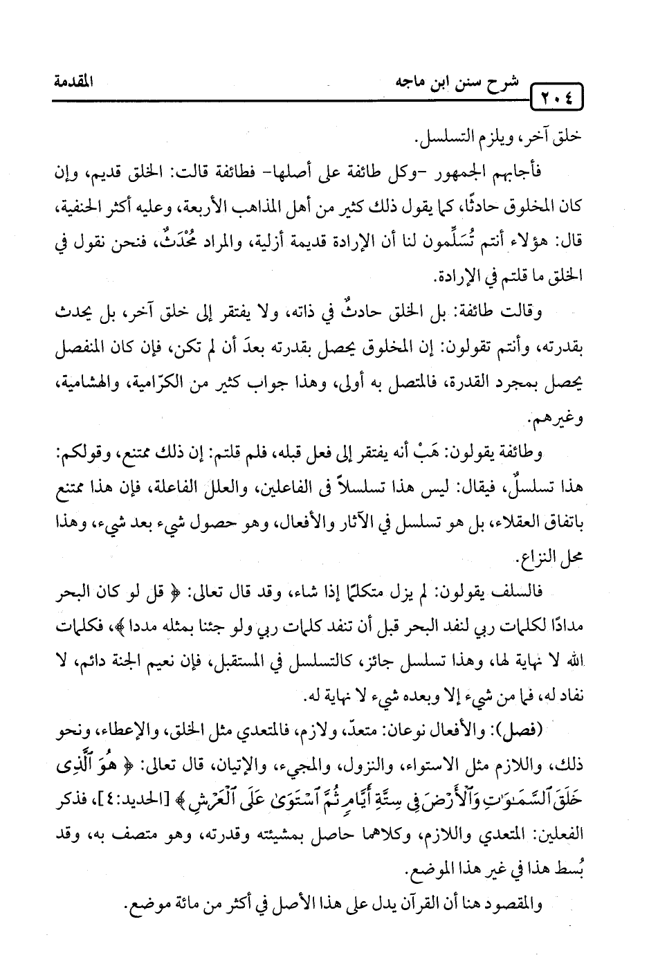 (فصل): والأفعال نوعان: متعدّ، ولازم، فالمتعدي مثل الخلق، والإعطاء، ونحو ذلك، واللازم مثل الاستواء، والنزول، والمجيء، والإتيان، قال تعالى: {هُوَ الَّذِي خَلَقَ السَّمَاوَاتِ وَالْأَرْضَ في سِتَّةِ أَيَّامٍ ثُمَّ اسْتَوَى عَلَى الْعَرْشِ} [الحديد: 4]، فذكر الفعلين: المتعدي واللازم، وكلاهما حاصل بمشيئته وقدرته، وهو متصف به، وقد بُسط هذا في غير هذا الموضع.
