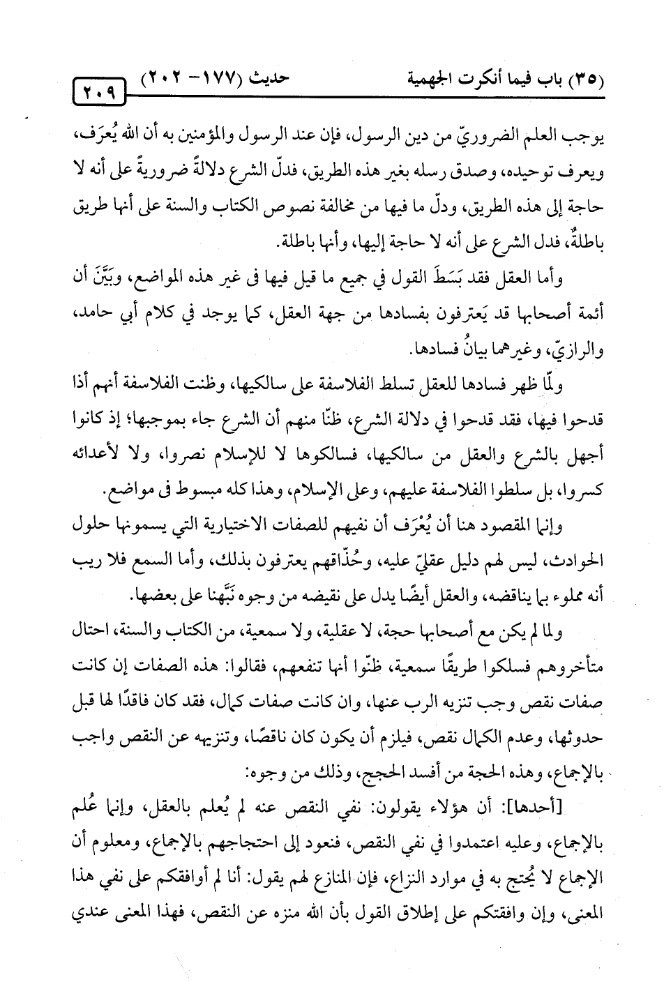 ولما لم يكن مع أصحابها حجة، لا عقلية، ولا سمعية، من الكتاب والسنة، احتال متأخروهم فسلكوا طريقًا سمعية، ظنّوا أنها تنفعهم، فقالوا: هذه الصفات إن كانت صفات نقص وجب تنزيه الرب عنها، وإن كانت صفات كمال، فقد كان فاقدًا لها قبل حدوثها، وعدم الكمال نقص، فيلزم أن يكون كان ناقصًا، وتنزيهه عن النقص واجب بالإجماع، وهذه الحجة من أفسد الحجج، وذلك من وجوه: