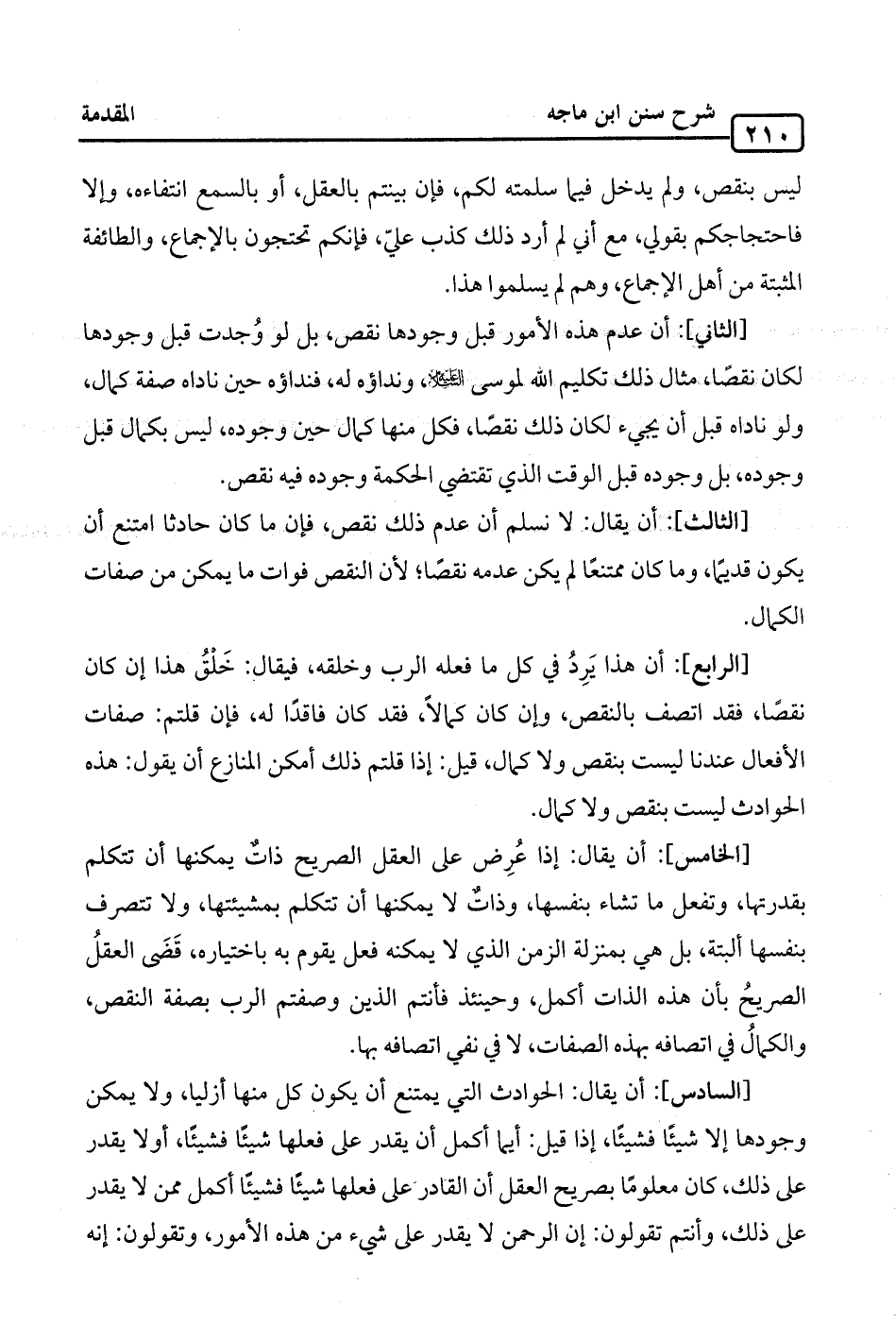 [السادس]: أن يقال: الحوادث التي يمتنع أن يكون كل منها أزليا، ولا يمكن وجودها إلا شيئًا فشيئًا، إذا قيل: أيما أكمل أن يقدر على فعلها شيئًا فشيئًا، أو لا يقدر على ذلك، كان معلومًا بصريح العقل أن القادر على فعلها شيئًا فشيئا أكمل ممن لا يقدر على ذلك، وأنتم تقولون: إن الرحمن لا يقدر على شيء من هذه الأمور، وتقولون: إنه