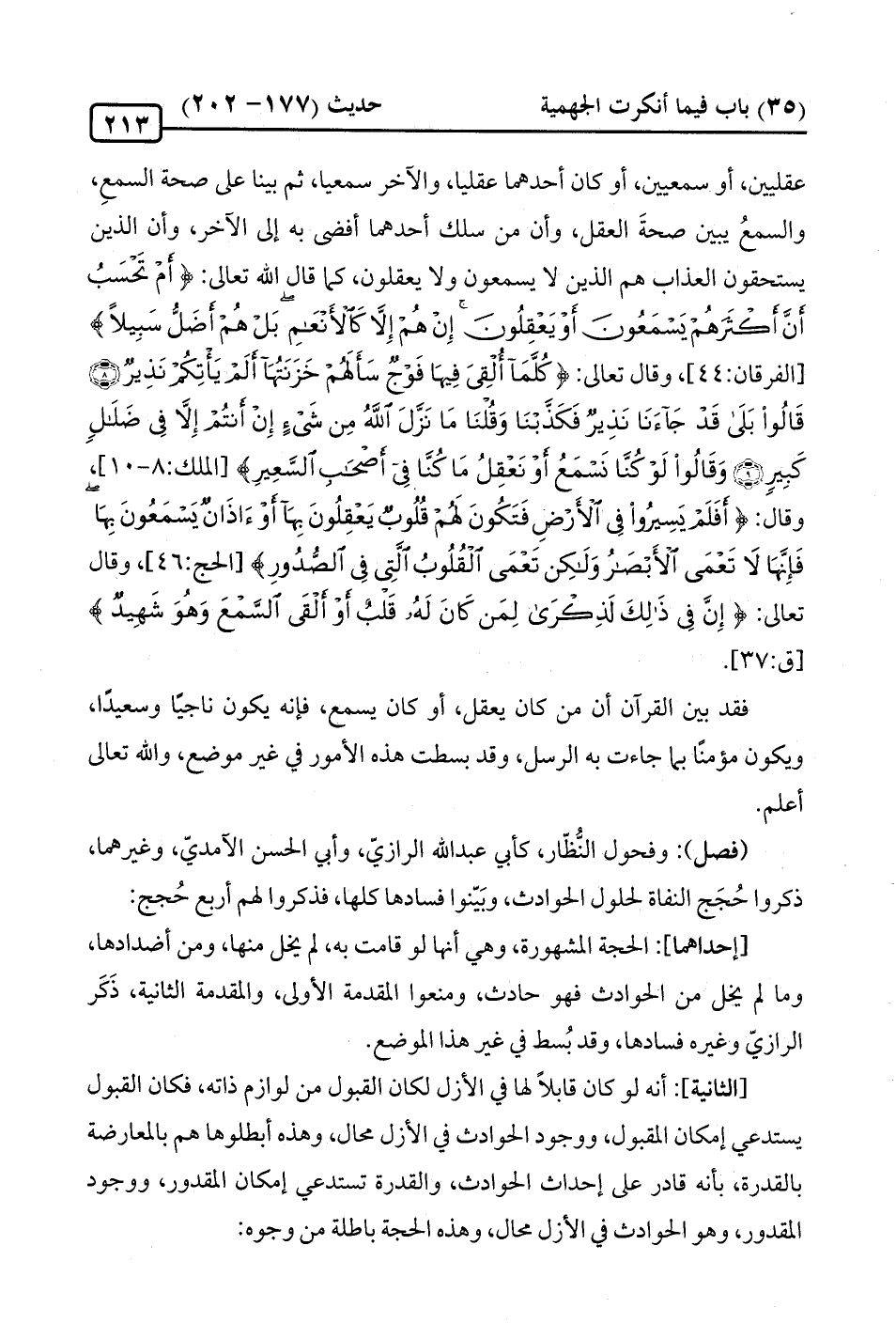 (فصل): وفحول النُّظّار، كأبي عبد الله الرازيّ، وأبي الحسن الآمديّ، وغيرهما، ذكروا حُجَج النفاة لحلول الحوادث، وبَيّنوا فسادها كلها، فذكروا لهم أربع حُجج: