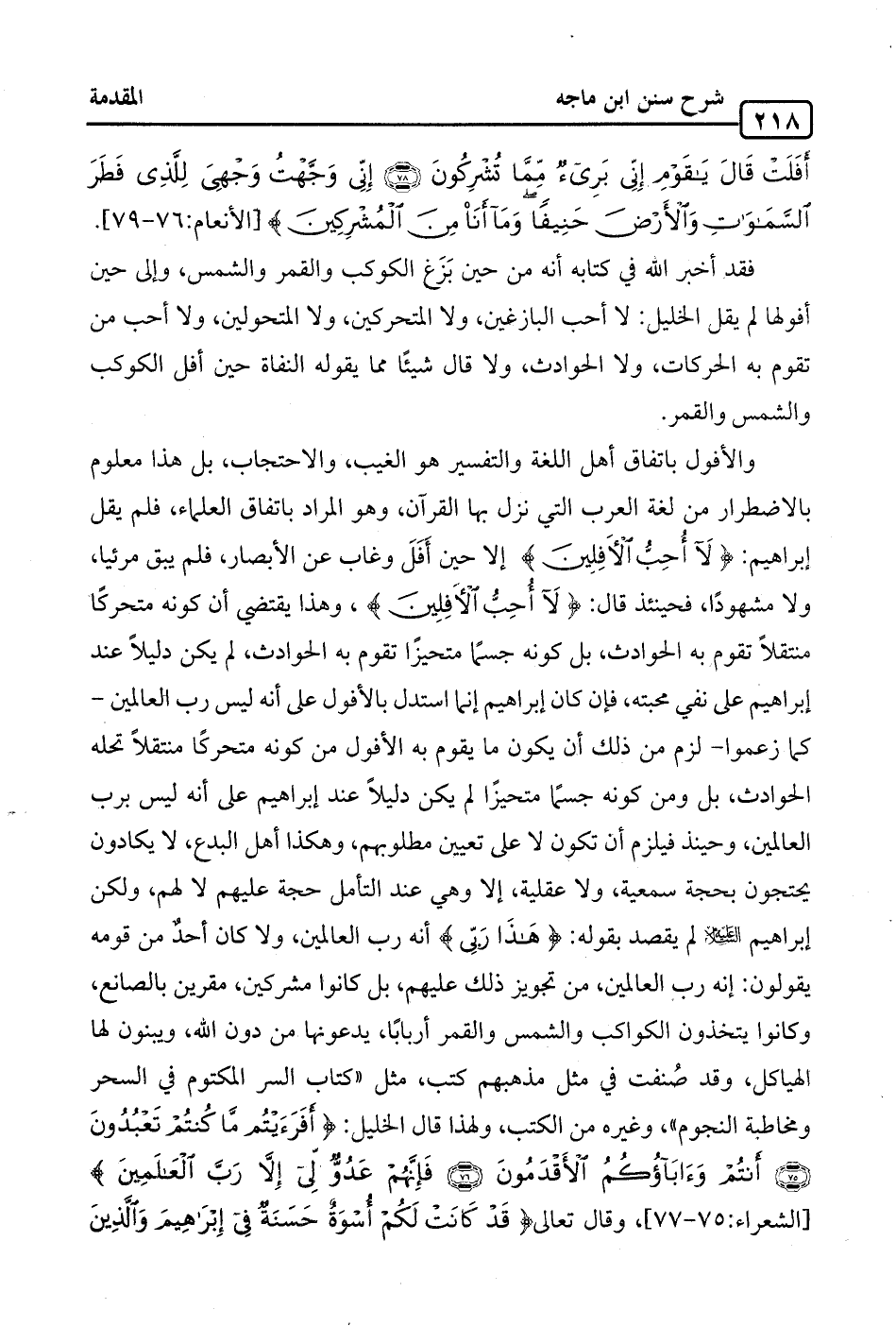 والأفول باتفاق أهل اللغة والتفسير هو الغيب، والاحتجاب، بل هذا معلوم بالاضطرار من لغة العرب التي نزل بها القرآن، وهو المراد باتفاق العلماء، فلم يقل إبراهيم: {لَا أُحِبُّ الْآفِلِينَ} إلا حين أَفَلَ وغاب عن الأبصار، فلم يبق مرئيا، ولا مشهودًا، فحينئذ قال: {لَا أُحِبُّ الْآفِلِينَ}، وهذا يقتضي أن كونه متحركًا منتقلًا تقوم به الحوادث، بل كونه جسمًا متحيزًا تقوم به الحوادث، لم يكن دليلًا عند إبراهيم على نفي محبته، فإن كان إبراهيم إنما استدل بالأفول على أنه ليس رب العالمين -كما زعموا- لزم من ذلك أن يكون ما يقوم به الأفول من كونه متحركًا منتقلًا تحله الحوادث، بل ومن كونه جسمًا متحيزًا لم يكن دليلًا عند إبراهيم على أنه ليس برب العالمين، وحينئذ فيلزم أن تكون لا على تعيين مطلوبهم، وهكذا أهل البدع، لا يكادون يحتجون بحجة سمعية، ولا عقلية، إلا وهي عند التأمل حجة عليهم لا لهم، ولكن إبراهيم - عليه السلام - لم يقصد بقوله: {هذَا ربي} أنه رب العالمين، ولا كان أحدٌ من قومه يقولون: إنه رب العالمين، من تجويز ذلك عليهم، بل كانوا مشركين، مقرين بالصانع، وكانوا يتخذون الكواكب والشمس والقمر أربابًا، يدعونها من دون الله، ويبنون لها الهياكل، وقد صُنفت في مثل مذهبهم كتب، مثل "كتاب السر المكتوم في السحر ومخاطبة النجوم"، وغيره من الكتب، ولهذا قال الخليل: {قَالَ أَفَرَأَيْتُمْ مَا كُنْتُمْ تَعْبُدُونَ (75) أَنْتُمْ وَآبَاؤُكُمُ الْأَقْدَمُونَ (76) فَإِنَّهُمْ عَدُوٌّ لِي إِلَّا رَبَّ الْعَالَمِينَ} [الشعراء: 75 - 77] وقال تعالى {قَدْ كَانَتْ لَكُمْ أُسْوَةٌ حَسَنَةٌ في إِبْرَاهِيمَ وَالَّذِينَ