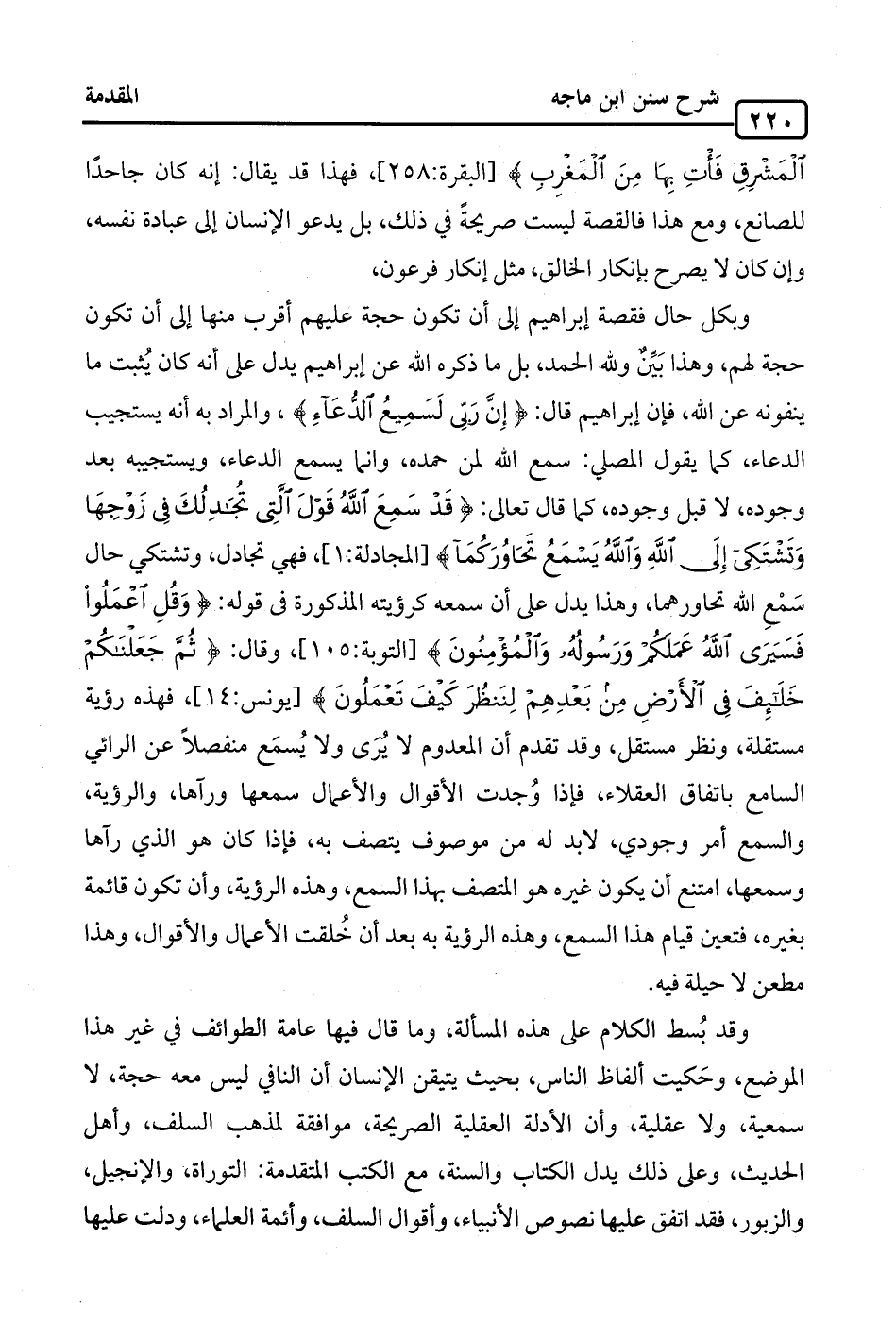 وبكل حال فقصة إبراهيم إلى أن تكون حجة عليهم أقرب منها إلى أن تكون حجة لهم، وهذا بَيِّنٌ ولله الحمد، بل ما ذكره الله عن إبراهيم يدل على أنه كان يُثبت ما ينفونه عن الله، فإن إبراهيم قال: {إِنَّ ربِّي لَسَمِيعُ الدُّعَاَءِ}، والمراد به أنه يستجيب الدعاء، كما يقول المصلي: سمع الله لمن حمده، وإنما يسمع الدعاء، ويستجيبه بعد وجوده، لا قبل وجوده، كما قال تعالى: {قَدْ سَمِعَ اللَّهُ قَوْلَ الَّتِي تُجَادِلُكَ في زَوْجِهَا وَتَشْتَكِي إِلَى اللَّهِ وَاللَّهُ يَسْمَعُ تَحَاوُرَكُمَا} [المجادلة:1] فهي تجادل، وتشتكي حال سَمْعِ الله تحاورهما، وهذا يدل على أن سمعه كرؤيته المذكورة في قوله: {وَقُلِ اعْمَلُوا فَسَيَرَى اللَّهُ عَمَلَكُمْ وَرَسُولُهُ وَالْمُؤْمِنُون} [التوبة: 105]، وقال: {ثُمَّ جَعَلْنَاكُمْ خَلَائِفَ في الْأَرْضِ مِنْ بَعْدِهِمْ لِنَنْظُرَ كَيْفَ تَعْمَلُونَ} [يونس: 14]، فهذه رؤية مستقلة، ونظر مستقل، وقد تقدم أن المعدوم لا يُرَى ولا يُسمَع منفصلًا عن الرائي السامع باتفاق العقلاء، فإذا وُجدت الأقوال والأعمال سمعها ورآها، والرؤية، والسمع أمر وجودي، لا بد له من موصوف يتصف به، فإذا كان هو الذي رآها وسمعها، امتنع أن يكون غيره هو المتصف بهذا السمع، وهذه الرؤية، وأن تكون قائمة بغيره، فتعين قيام هذا السمع، وهذه الرؤية به بعد أن خُلقت الأعمال والأقوال، وهذا مطعن لا حيلة فيه.