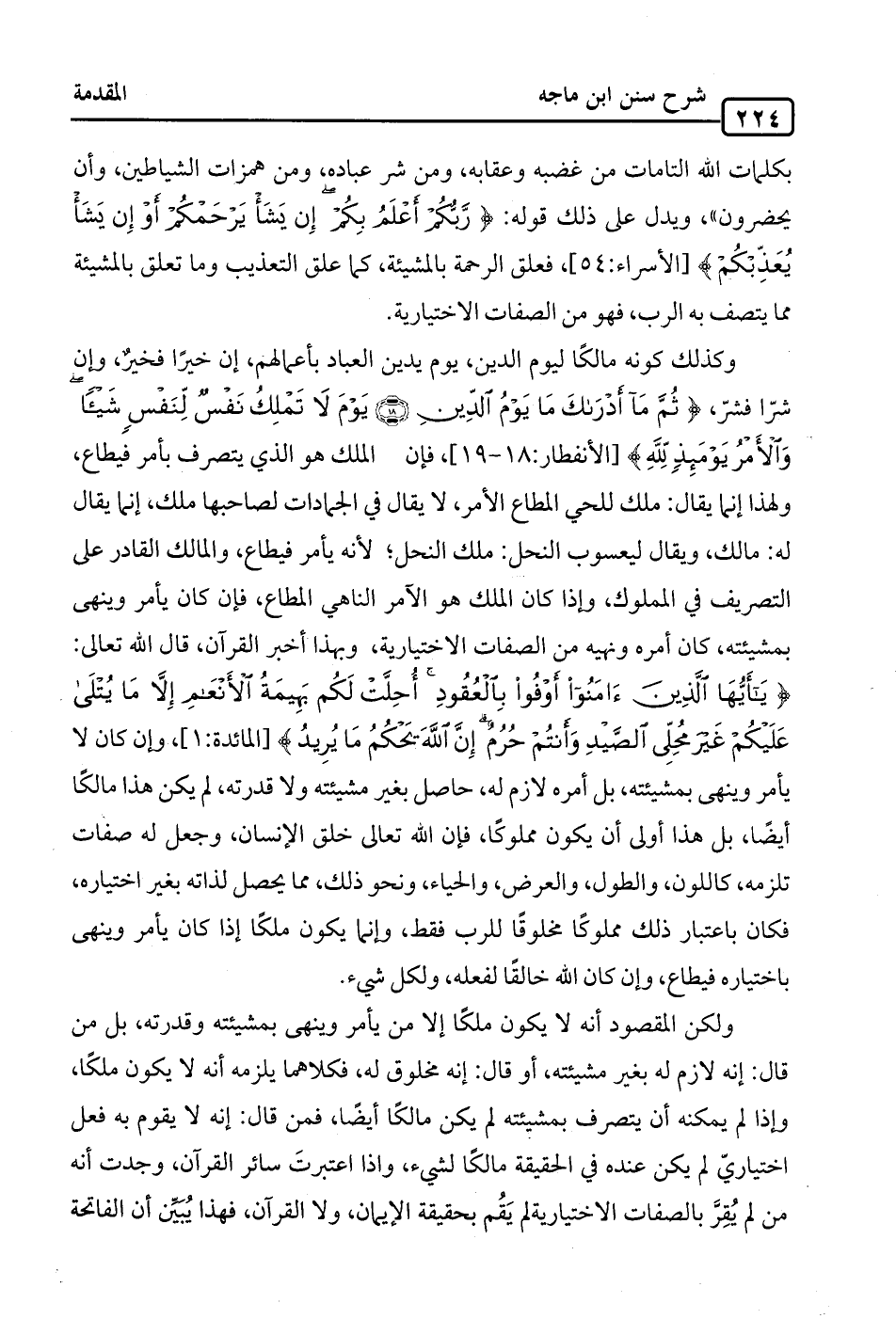 ولكن المقصود أنه لا يكون ملكًا إلا من يأمر وينهى بمشيئته وقدرته، بل من قال: إنه لازم له بغير مشيئته، أو قال: إنه مخلوق له، فكلاهما يلزمه أنه لا يكون ملكًا، وإذا لم يمكنه أن يتصرف بمشيئته لم يكن مالكًا أيضًا، فمن قال: إنه لا يقوم به فعل اختياريّ لم يكن عنده في الحقيقة مالكًا لشيء، وإذا اعتبرتَ سائر القرآن، وجدت أنه من لم يُقِرَّ بالصفات الاختيارية لم يَقُم بحقيقة الإيمان، ولا القرآن، فهذا يُبَيِّن أن الفاتحة