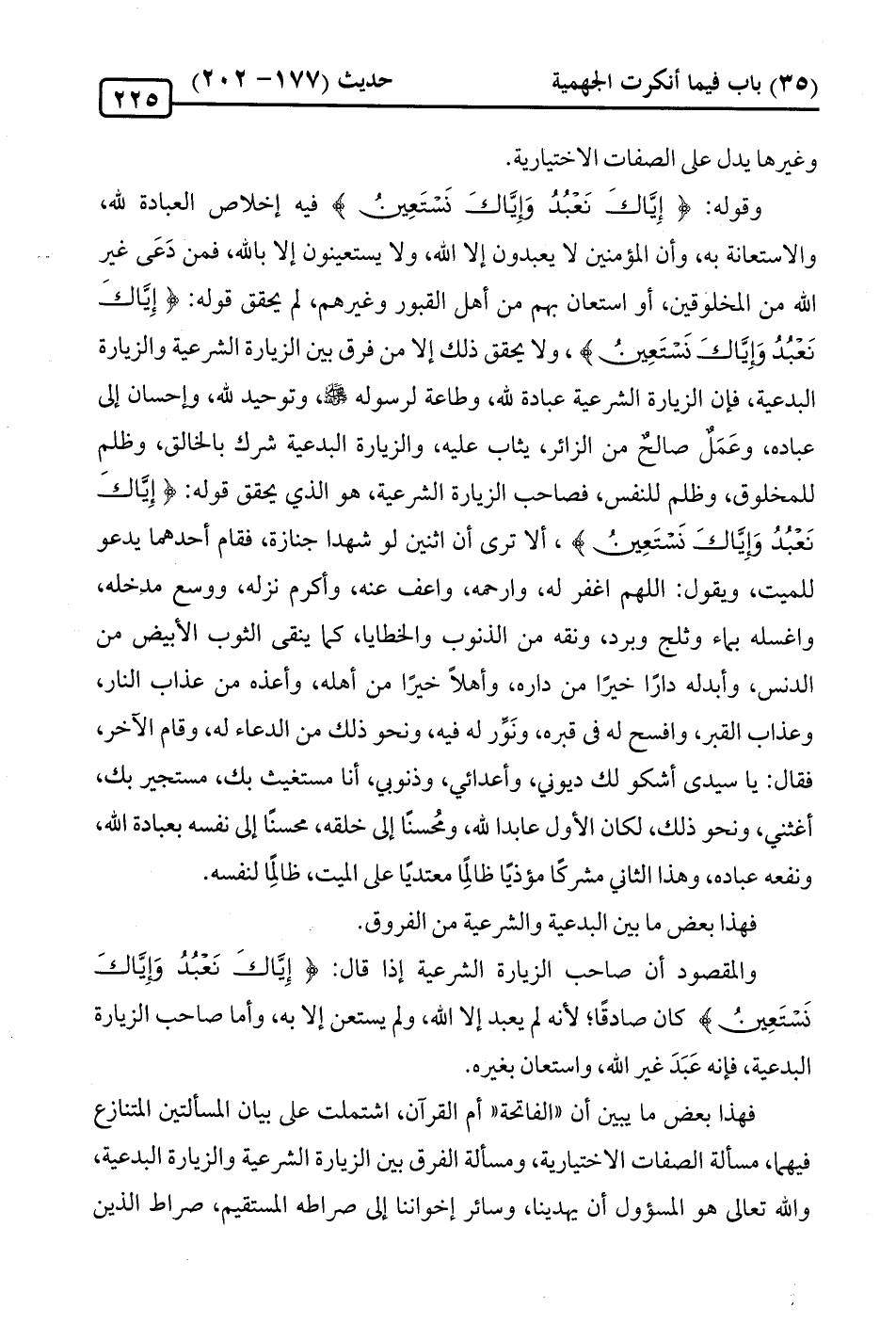 فهذا بعض ما يبين أن "الفاتحة" أم القرآن، اشتملت على بيان المسألتين المتنازع فيهما، مسألة الصفات الاختيارية، ومسألة الفرق بين الزيارة الشرعية والزيارة البدعية، والله تعالى هو المسؤول أن يهدينا، وسائر إخواننا إلى صراطه المستقيم، صراط الذين