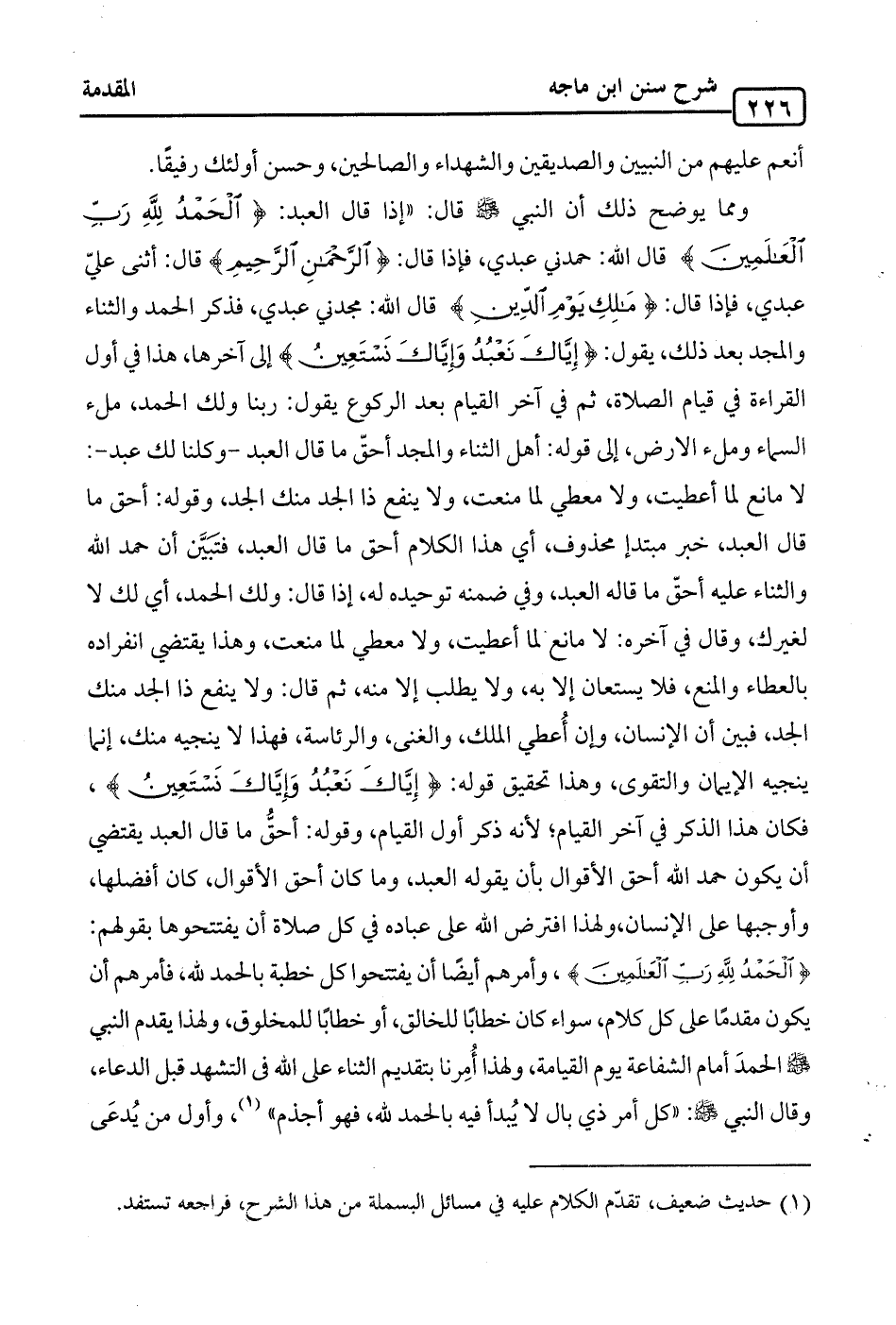 ومما يوضح ذلك أن النبي -صلى الله عليه وسلم- قال: "إذا قال العبد: {الْحَمْدُ لِلَّهِ رَبِّ الْعَالَمِينَ} قال الله: حمدني عبدي، فإذا قال: {الرَّحْمَنِ الرَّحِيمِ} قال: أثنى عليّ عبدي، فإذا قال: {مَالِكِ يَوْمِ الدِّينِ} قال الله: مجدني عبدي، فذكر الحمد والثناء والمجد بعد ذلك، يقول: {إِيَّاكَ نَعْبُدُ وَإِيَّاكَ نَسْتَعِينُ} إلى آخرها، هذا في أول القراءة في قيام الصلاة، ثم في آخر القيام بعد الركوع يقول: ربنا ولك الحمد، ملء السماء وملء الارض، إلى قوله: أهل الثناء والمجد أحقّ ما قال العبد -وكلنا لك عبد-: لا مانع لما أعطيت، ولا معطي لما منعت، ولا ينفع ذا الجد منك الجد، وقوله: أحق ما قال العبد، خبر مبتدإ محذوف، أي هذا الكلام أحق ما قال العبد، فتبَيَّن أن حمد الله والثناء عليه أحقّ ما قاله العبد، وفي ضمنه توحيده له، إذا قال: ولك الحمد، أي لك لا لغيرك، وقال في آخره: لا مانع لما أعطيت، ولا معطي لما منعت، وهذا يقتضي انفراده بالعطاء والمنع، فلا يستعان إلا به، ولا يطلب إلا منه، ثم قال: ولا ينفع ذا الجد منك الجد، فبين أن الإنسان، وإن أُعطي الملك، والغنى، والرئاسة، فهذا لا ينجيه منك، إنما ينجيه الإيمان والتقوى، وهذا تحقيق قوله: {إِيَّاكَ نَعْبُدُ وَإِيَّاكَ نَسْتَعِينُ}، فكان هذا الذكر في آخر القيام؛ لأنه ذكر أول القيام، وقوله: أحقُّ ما قال العبد يقتضي أن يكون حمد الله أحق الأقوال بأن يقوله العبد، وما كان أحق الأقوال، كان أفضلها، وأوجبها على الإنسان، ولهذا افترض الله على عباده في كل صلاة أن يفتتحوها بقولهم: {الْحَمْدُ لِلَّهِ رَبِّ الْعَالَمِينَ}، وأمرهم أيضًا أن يفتتحوا كل خطبة بالحمد لله، فأمرهم أن يكون مقدمًا على كل كلام، سواء كان خطابًا للخالق، أو خطابًا للمخلوق، ولهذا يقدم النبي -صلى الله عليه وسلم- الحمدَ أمام الشفاعة يوم القيامة، ولهذا أُمِرنا بتقديم الثناء على الله في التشهد قبل الدعاء، وقال النبي -صلى الله عليه وسلم-: "كل أمر ذي بال لا يُبدأ فيه بالحمد لله، فهو أجذم" (¬1)، وأول من يُدعَى