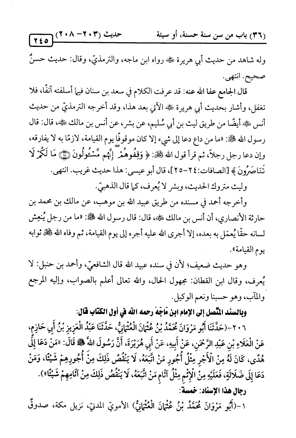 206 - (حَدَّثَنَا أبو مَرْوَانَ مُحَمَّدُ بْنُ عُثمانَ الْعُثماني، حَدَّثَنَا عَبْدُ الْعَزِيزِ بْنُ أَبِي حَازِمٍ، عَنْ الْعَلَاءِ بْنِ عَبْدِ الرحمَنِ، عَنْ أَبِيهِ، عَنْ أَبِي هُرَيْرَةَ، أَنَّ رَسُولَ الله -صلى الله عليه وسلم- قَالَ: "مَنْ دَعَا إِلى هُدًى، كَانَ لَهُ مِنْ الْأَجْرِ مِثْلُ أُجُورِ مَنْ اتَّبَعَهُ، لَا يَنْقُصُ ذَلِكَ مِن أُجُورِهِم شَيْئًا، وَمَنْ دَعَا إِلَى ضَلَالَةٍ، فَعَلَيْهِ مِنْ الْإِثْمِ مِثْلُ آثَامِ مَنْ اتَّبَعَهُ، لَا يَنْقُصُ ذَلِكَ مِنْ آثَامِهم شَيْئًا").