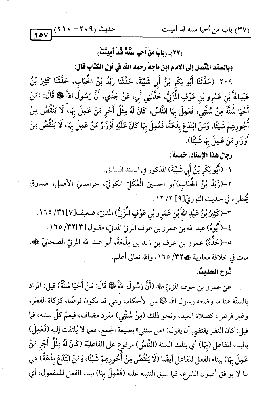 209 - (حَدَثَنَا أبو بَكْرِ بْنُ أَبِي شَيْبةَ، حَدَّثَنَا زَيْدُ بْنُ الحُبَابِ، حَدَثَنَا كَثِيرُ بْنُ عَبْدِ الله بْنِ عَمرِو بْنِ عَوْفٍ المُزَنِيُّ، حَدَّثَني أَبِي، عَنْ جَدِّي، أَنَّ رَسُولَ الله -صلى الله عليه وسلم- قَالَ: "مَنْ أَحيَا سُنّة مِنْ سُنَّتِي، فَعَمِلَ بِها النَّاسُ، كَانَ لَهُ مِثْلُ أَجْرِ مَنْ عَمِلَ بِها، لَا يَنْقُصُ مِنْ أُجُورِهم شَيْئًا، وَمَنْ ابْتَدَع بِدْعَةً، فَعُمِلَ بِها كَانَ عَلَيْهِ أَوْزَارُ مَنْ عَمِلَ بِها، لَا يَنْقُصُ مِنْ أَوْزَارِ مَنْ عَمِلَ بِها شَيْئًا".