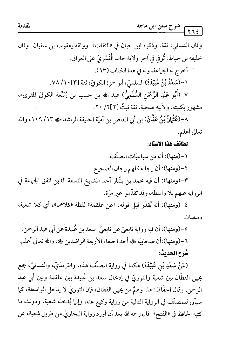 (عَنْ سَعْدِ بْنِ عُبَيْدة) هكذا في رواية المصنّف هذه، والترمذيّ، والنسائيّ، جمع يحيى القطّان بين شعبة والثوريّ في إدخال سعد بن عُبيدة بين علقمة وبين أبي عبد الرحمن، وقال الحفّاظ: هذا وهمٌ من يحيى القطان، فإن الثوريّ لا يدخل الواسطة، كما سيأتي للمصنّف في الرواية التالية من رواية وكيع عنه، وإنما يُدخله شعبة، ودونك ما كتبه الحافظ في "الفتح": قال رحمه الله بعد أن أورد رواية البخاريّ من طريق شعبة، عن
