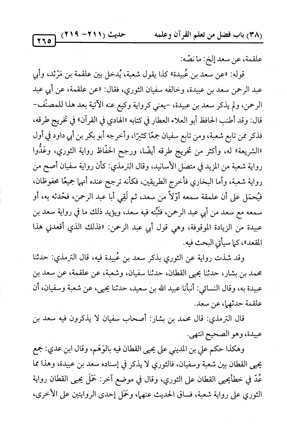 قوله: "عن سعد بن عُبيدة" كذا يقول شعبة، يُدخل بين علقمة بن مَرْثد، وأبي عبد الرحمن سعد بن عبيدة، وخالفه سفيان الثوري، فقال: "عن علقمة، عن أبي عبد الرحمن، ولم يذكر سعد بن عبيدة، -يعني كرواية وكيع عنه الآتية بعد هذا للمصنّف- قال: وقد أطنب الحافظ أبو العلاء العطار في كتابه "الهادي في القرآن" في تخريج طرقه، فذكر ممن تابع شعبة، ومن تابع سفيان جمعًا كثيرًا، وأخرجه أبو بكر بن أبي داود في أول "الشريعة" له، وأكثر من تخريج طرقه أيضًا، ورجح الحفّاظ رواية الثوري، وعَدُّوا رواية شعبة من المزيد في متصل الأسانيد، وقال الترمذي: كأن رواية سفيان أصح من رواية شعبة، وأما البخاري فأخرج الطريقين، فكأنه ترجح عنده أنهما جميعًا محفوظان، فيُحمَل على أن علمقة سمعه أوّلًا من سعد، ثم لَقِي أبا عبد الرحمن، فحّدثه به، أو سمعه مع سعد من أبي عبد الرحمن، فثَبَّته فيه سعد، ويؤيد ذلك ما في رواية سعد بن عبيدة من الزيادة الموقوفة، وهي قول أبي عبد الرحمن: "فذلك الذي أقعدني هذا المقعد"، كما سيأتي البحث فيه.