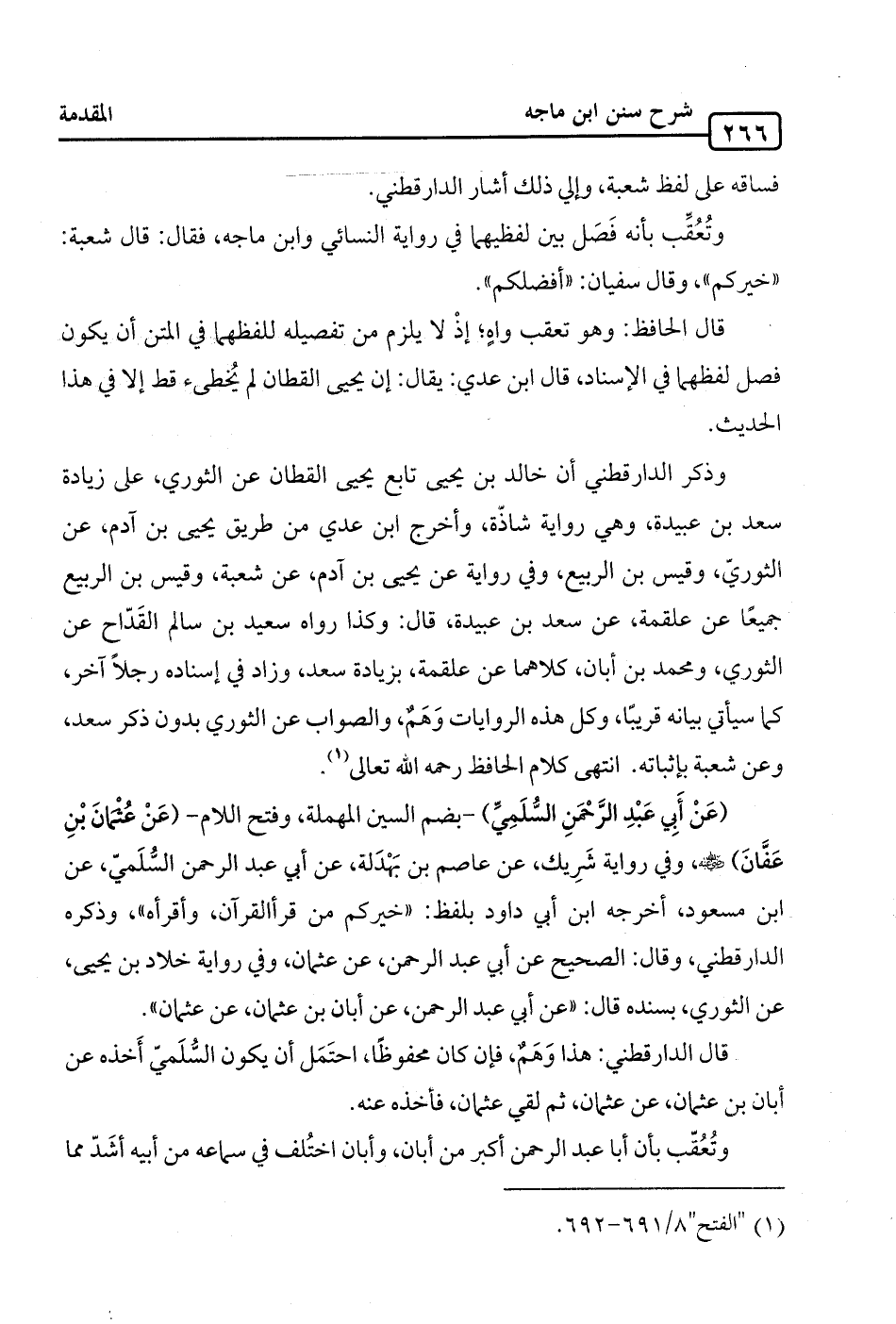 وذكر الدارقطفي أن خالد بن يحيى تابع يحيى القطان عن الثوري، على زيادة سعد بن عبيدة، وهي رواية شاذة، وأخرج ابن عدي من طريق يحيى بن آدم، عن الثوريّ، وقيس بن الربيع، وفي رواية عن يحيى بن آدم، عن شعبة، وقيس بن الربيع جميعًا عن علقمة، عن سعد بن عبيدة، قال: وكذا رواه سعيد بن سالم القَدّاح عن الثوري، ومحمد بن أبان، كلاهما عن علقمة، بزيادة سعد، وزاد في إسناده رجلًا آخر، كما سيأتي بيانه قريبًا، وكل هذه الروايات وَهمٌ، والصواب عن الثوري بدون ذكر سعد، وعن شعبة بإثباته. انتهى كلام الحافظ رحمه الله تعالى (¬1).