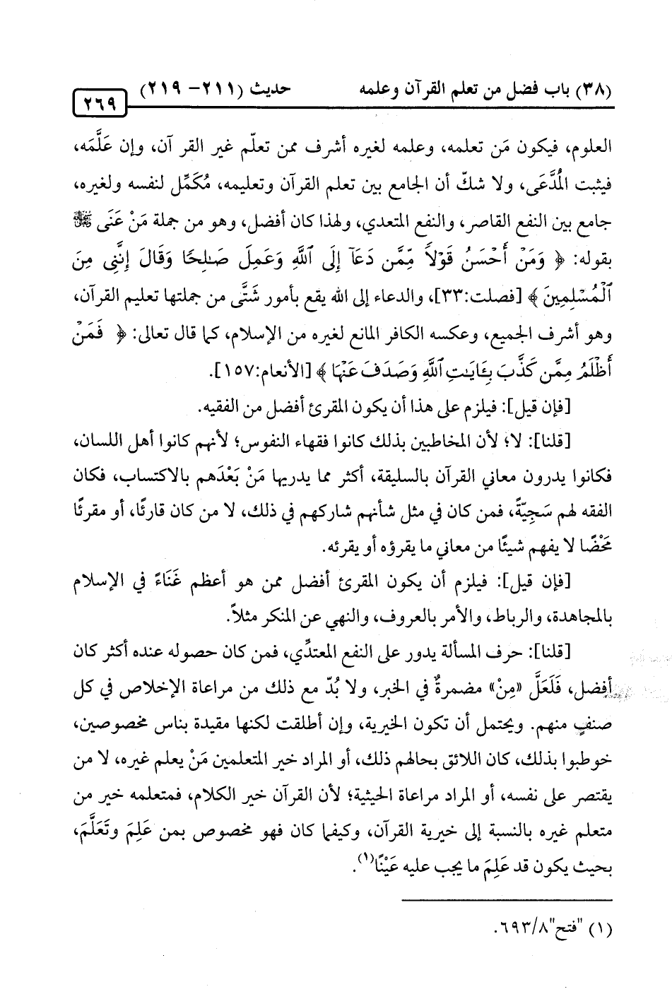 العلوم، فيكون مَن تعلمه، وعلمه لغيره أشرف ممن تعلّم غير القرآن، كان عَلَّمَه، فيثبت المُدَّعَى، ولا شكّ أن الجامع بين تعلم القرآن وتعليمه، مُكَمِّل لنفسه ولغيره، جامع بين النفع القاصر، والنفع المتعدي، ولهذا كان أفضل، وهو من جملة مَنْ عَنَى -سبحانه وتعالى- بقوله: {وَمَنْ أَحْسَنُ قَوْلًا مِمَّنْ دَعَا إِلَى اللَّهِ وَعَمِلَ صَالِحًا وَقَالَ إِنَّنِي مِنَ الْمُسْلِمِينَ} [فصلت: 33]، والدعاء إلى الله يقع بأمور شَتَّى من جملتها تعليم القرآن، وهو أشرف الجميع، وعكسه الكافر المانع لغيره من الإسلام، كما قال تعالى: {فَمَنْ أَظْلَمُ مِمَّنْ كَذَّبَ بِآيَاتِ اللَّهِ وَصَدَفَ عَنْهَا} [الأنعام: 157].