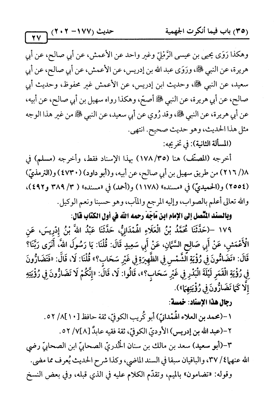179 - (حَدَّثَنَا مُحَمَّدُ بْنُ الْعَلَاءِ الهمْدَانِيُّ، حَدَّثَنَا عَبْدُ الله بْنُ إِدْرِيسَ، عَنِ الْأَعْمَشِ، عَنْ أَبِي صَالِحٍ السَّمانِ، عَنْ أَبِي سَعِيدٍ قَالَ: قُلْنَا: يَا رَسُولَ الله، أَنَرَى رَبَّنَا؟ قَالَ: "تَضَامُّونَ في رُؤيةِ الشَّمْسِ في الظَّهِيرَةِ في غَيْرِ سَحَاب؟ " قُلْنَا: لَا، قَال: "فَتَضَارُّونَ في رُؤْيَةِ الْقَمَرِ لَيْلَةَ الْبَدْرِ في غَيْرِ سَحَابٍ؟ "، قَالُوا: لَا، قَال: "إِنَّكُمْ لَا تَضَارُّونَ في رُؤْيَتِهِ إِلَّا كَمَا تَضَارُّونَ في رُؤيتِهِمَا").