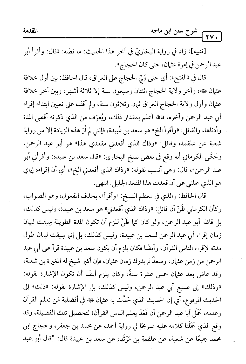 قال الحافظ: والذي في معظم النسخ: "وأقرأ"، بحذف المفعول، وهو الصواب، وكأن الكرماني ظَنّ أن قائل: "وذاك الذي أقعدني" هو سعد بن عبيدة، وليس كذلك، بل قائله أبو عبد الرحمن، ولو كان كما ظَنَّ للزم أن تكون المدة الطويلة سِيقت لبيان زمان إقراء أبي عبد الرحمن لسعد بن عبيدة، وليس كذلك، بل إنما سِيقت لبيان طول مدته لإقراء الناس القرآن، وأيضًا فكان يلزم أن يكون سعد بن عبيدة قرأ على أبي عبد الرحمن من زمن عثمان، وسعد لم يدرك زمان عثمان، فإن أكبر شيخ له المغيرة بن شعبة، وقد عاش بعد عثمان خمس عشرة سنةً، وكان يلزم أيضًا أن تكون الإشارة بقوله: "وذلك" إلى صنيع أبي عبد الرحمن، وليس كذلك، بل الإشارة بقوله: "ذلك" إلى الحديث المرفوع، أي إن الحديث الذي حَدَّث به عثمان - رضي الله عنه - في أفضلية مَن تعلم القرآن وعلمه، حَمَلَ أبا عبد الرحمن أن قَعَدَ يعلم الناس القرآن؛ لتحصيل تلك الفضيلة، وقد وقع الذي حَمَلْنا كلامه عليه صريحًا في رواية أحمد، عن محمد بن جعفر، وحجاج ابن محمد جميعًا عن شعبة، عن علقمة بن مَرْثَد، عن سعد بن عبيدة قال: "قال أبو عبد