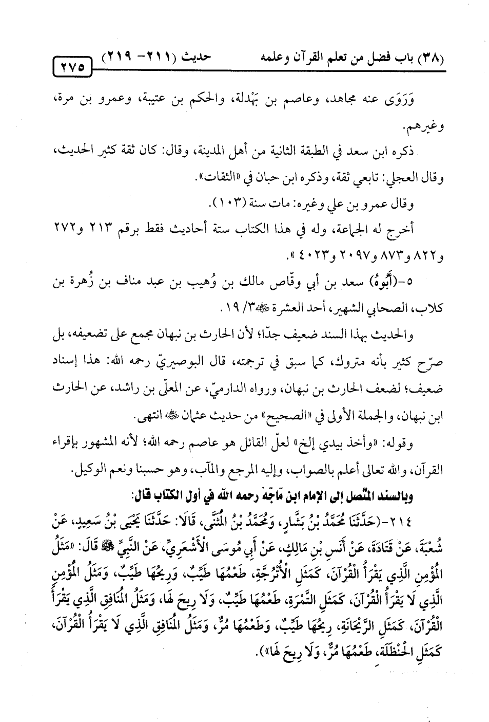 214 - (حَدَّثَنَا مُحَمَّدُ بنُ بشارٍ، وَمُحَمَّدُ بن المثَنَّى، قَالَا: حَدَّثَنَا يَحيَى بن سعِيدٍ، عَنْ شُعبة، عَنْ قَتَادَةَ، عَنْ أنسِ بْنِ مَالِكٍ، عَنْ أَبِي مُوسَى الْأَشْعَرِيِّ، عَنْ النَّبِيِّ -صلى الله عليه وسلم- قَالَ: "مَثَلُ المؤْمِن الَذِي يَقْرَأُ الْقرآنَ، كَمَثَلِ الْأُتْرُجَّةِ، طَعمُها طَيِّبٌ، وَرِيحُها طَيِّبٌ، وَمَثَلُ المؤْمِن الَّذِي لَا يَقْرَأ القُرانَ، كمَثَلِ التّمرَةِ، طَعمُها طَيِّبٌ، وَلَا رِيحَ لها، وَمَثَلُ المنافِقِ الَذِي يَقْرَأ الْقُرآنَ، كَمَثَلِ الرَّيْحَانَةِ، رِيحُها طَيِّب، وَطَعمُها مرٌّ، وَمَثَلُ المنافِقِ الَّذِي لَا يَقْرَأُ القرآنَ، كَمَثَلِ الحنْظَلَة، طَعمُها مُرٌّ، وَلَا رِيحَ لها").