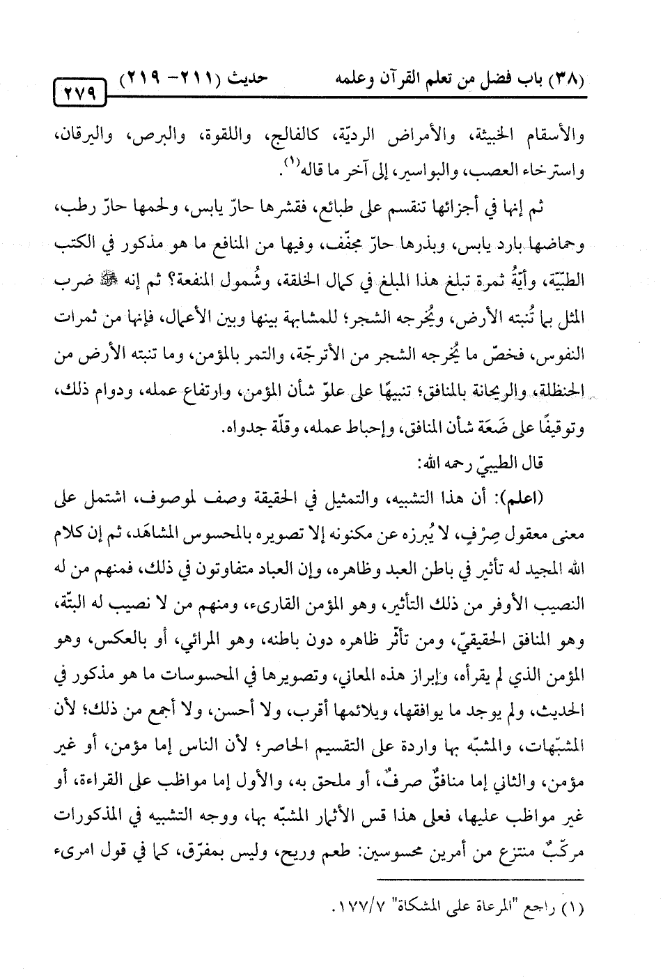 (اعلم): أن هذا التشبيه، والتمثيل في الحقيقة وصف لموصوف، اشتمل على معنى معقول صِرْفٍ، لا يُبرزه عن مكنونه إلا تصويره بالمحسوس المشاهد، ثم إن كلام الله المجيد له تأثير في باطن العبد وظاهره، وإن العباد متفاوتون في ذلك، فمنهم من له النصيب الأوفر من ذلك التأثير، وهو المؤمن القارىء، ومنهم من لا نصيب له البتة، وهو المنافق الحقيقي، ومن تأثّر ظاهره دون باطنه، وهو المرائي، أو بالعكس، وهو المؤمن الذي لم يقرأه، وإبراز هذه المعاني، وتصويرها في المحسوسات ما هو مذكور في الحديث، ولم يوجد ما يوافقها، ويلائمها أقرب، ولا أحسن، ولا أجمع من ذلك؛ لأن المشبهات، والمشبّه بها واردة على التقسيم الحاصر؛ لأن الناس إما مؤمن، أو غير مؤمن، والثاني إما منافق صرفٌ، أو ملحق به، والأول إما مواظب على القراءة، أو غير مواظب عليها، فعلى هذا قس الأثمار المشبّه جها، ووجه التشبيه في المذكورات مركّبٌ منتزع من أمرين محسوسين: طعم وريح، وليس بمفرّق، كما في قول امرىء