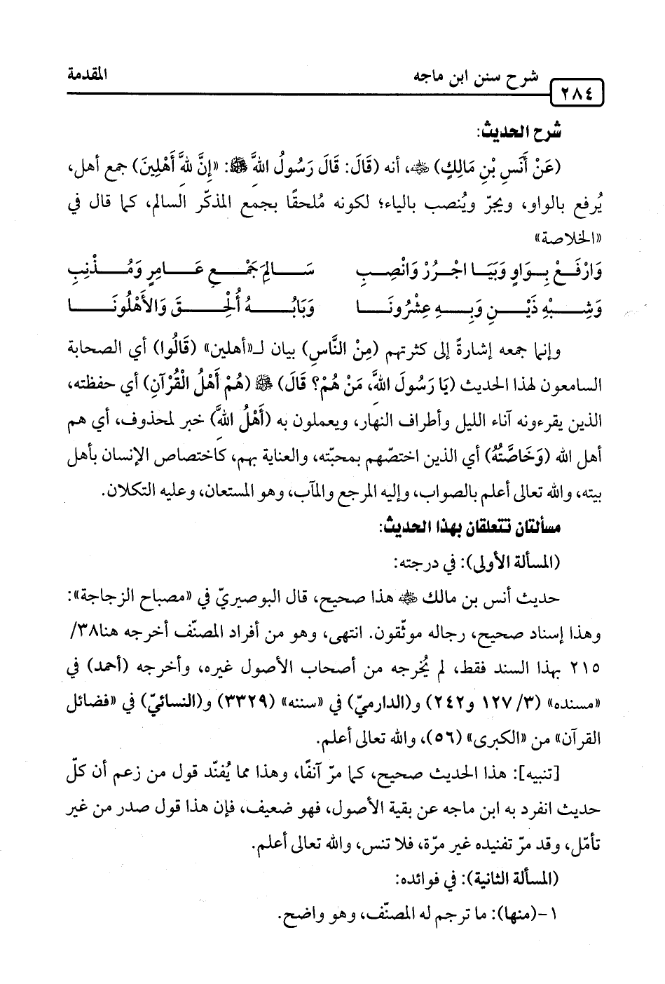 (عَنْ أَنسِ بْنِ مَالك) -رضي الله عنه-، أنه (قَالَ: قَالَ رَسُولُ الله -صلى الله عليه وسلم-: "إِنَّ لله أَهْلِينَ) جمع أهل، يُرفع بالواو، ويجرّ ويُنصب بالياء؛ لكونه مُلحقًا بجمع الذكّر السالم، كما قال في "الخلاصة":