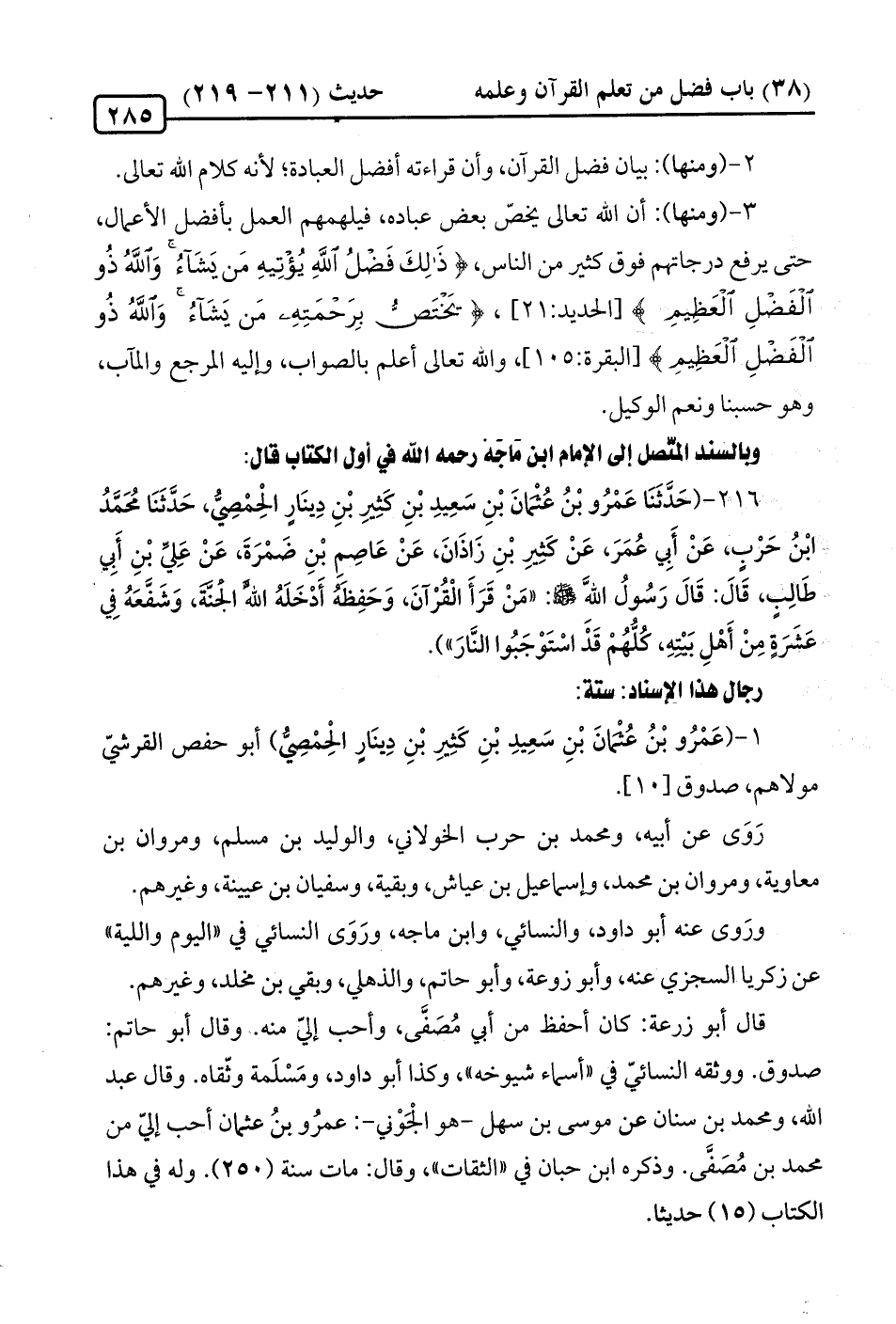216 - (حَدَّثَنَا عَمْرُو بْنُ عُثْمانَ بْنِ سَعِيدِ بْنِ كَثِيرِ بْنِ دِينَارٍ الحمصِيُّ، حَدَّثَنَا مُحَمَدُ ابْنُ حَربٍ، عَنْ أَبِي عُمَرَ، عَنْ كَثِيرِ بْنِ زَاذَانَ، عَنْ عَاصِمِ بْنِ ضَمرَةَ، عَنْ عَليِّ بْنِ أَبِي طَالِبٍ، قَالَ: قَالَ رَسُولُ الله -صلى الله عليه وسلم-: "مَنْ قَرَأَ الْقرآنَ، وَحَفِظَهُ أَدخَلَهُ الله الجنّةَ، وَشَفَّعَهُ في عَشَرَةٍ مِنْ أَهْلِ بَيْتهِ، كُلُّهُم قَدْ اسْتَوْجَبُوا النَّارَ").
