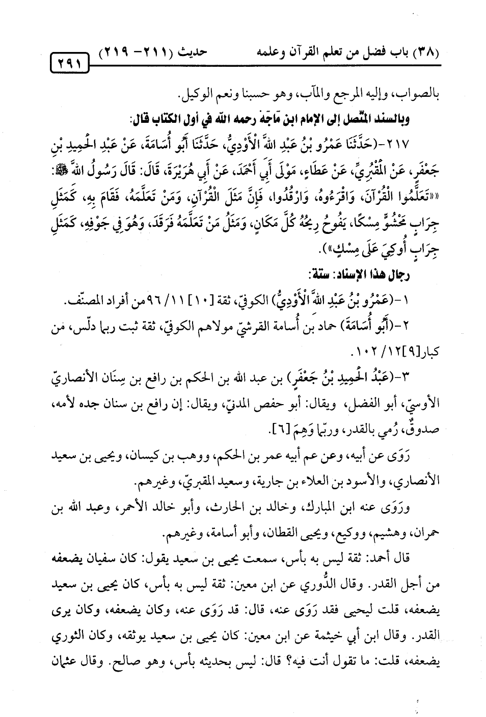217 - (حَدَّثَنَا عَمْرُو بْنُ عَبدِ الله الْأَوْدِيُّ، حَدَّثَنَا أبو أُسَامَةَ، عَنْ عَبْدِ الحمِيدِ بْنِ جَعفَرٍ، عَنْ المقْبُرِيِّ، عَنْ عَطَاءٍ، مَوْلَى أَبِي أحمَدَ، عَنْ أَبِي هُرَيْرَةَ، قَالَ: قَالَ رَسُولُ الله -صلى الله عليه وسلم-: "تَعَلَّمُوا الْقرآنَ، وَاقْرَءُوهُ، وَارقُدُوا، فإِنَّ مَثَلَ القُرْآنِ، وَمَنْ تَعَلَّمَهُ، فَقَامَ بِهِ، كمَثَلِ جِرَابٍ مَحشُوٍّ مِسْكًا، يَفُوحُ رِيحُهُ كلَّ مَكَانٍ، وَمَثَلُ مَنْ تَعَلَّمَهُ فَرَقَدَ، وَهُوَ في جَوْفِهِ، كمَثَلِ جِرَابٍ أُوكِيَ عَلَى مِسْكٍ").