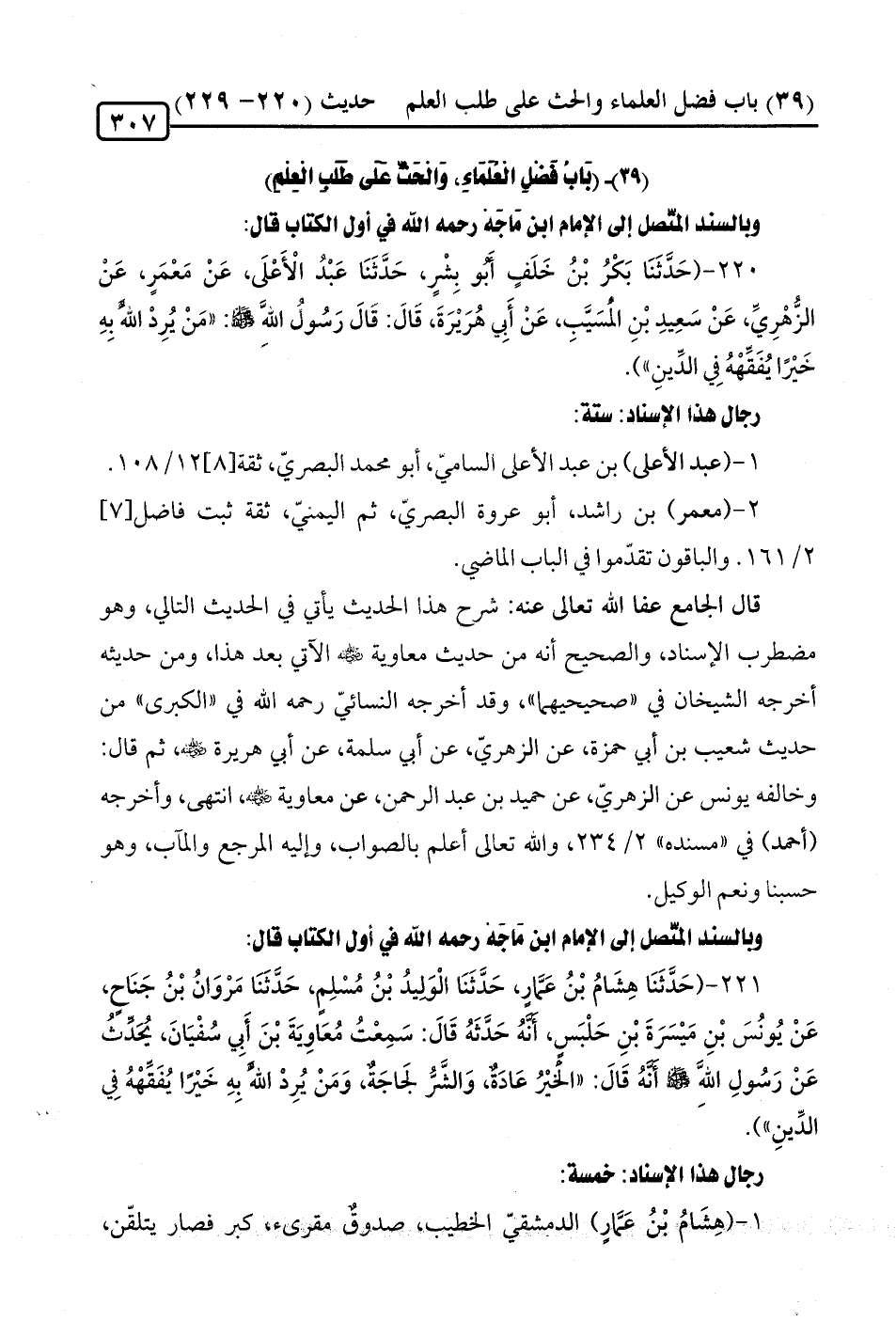 220 - (حَدَّثَنَا بَكْرُ بْنُ خَلَفٍ أَبُو بِشرٍ، حَدَّثَنَا عَبْدُ الْأَعْلَى، عَنْ مَعْمَرٍ، عنْ الزُّهْرِيِّ، عنْ سَعِيدِ بْنِ المُسَيَّبِ، عن أَبِي هُرَيرَةَ، قالَ: قَالَ رَسول اللَّه -صلى الله عليه وسلم-: "مَنْ يُرِدْ الله بِهِ خَيْرًا يُفَقِّهْهُ في الدِّينِ").