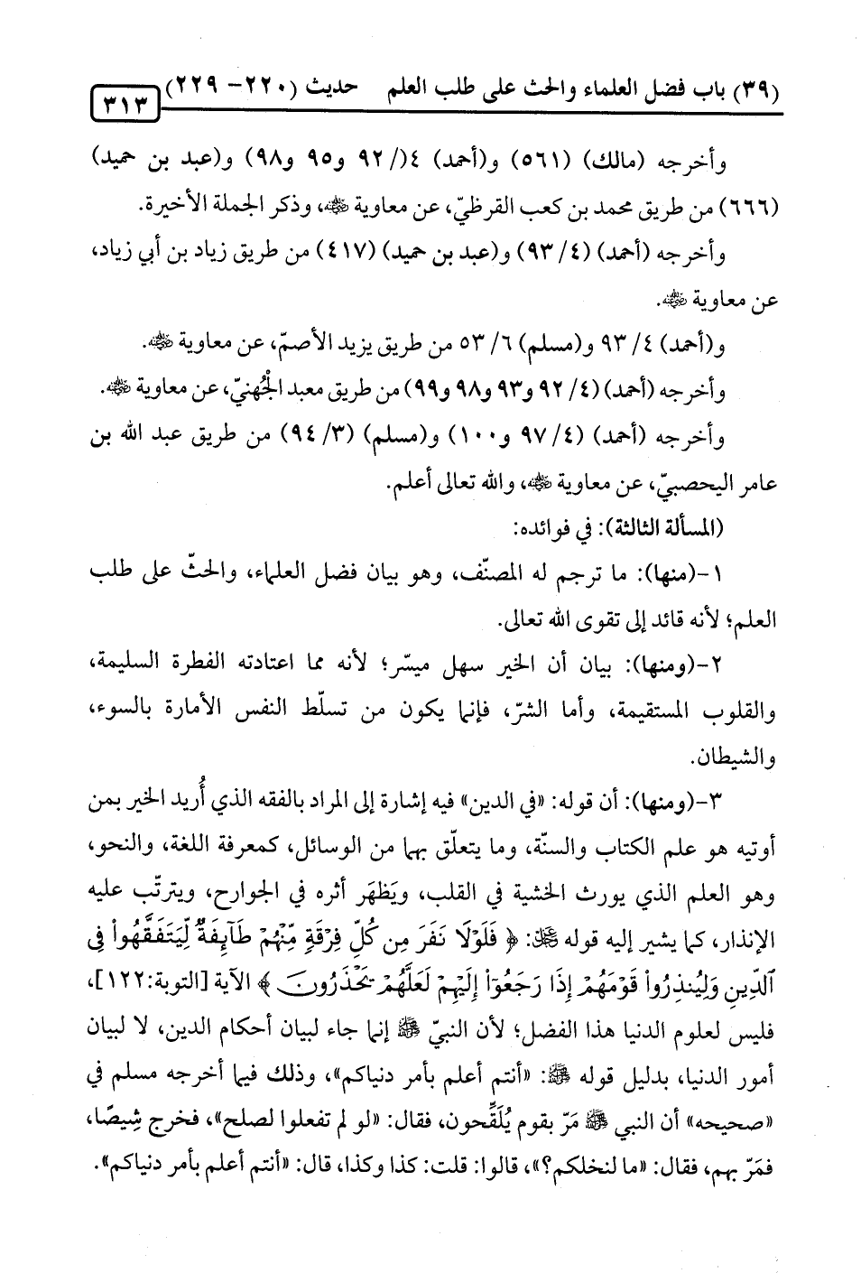 3 - (ومنها): أن قوله: "في الدين" فيه إشارة إلى المراد بالفقه الذي أُريد الخير بمن أوتيه هو علم الكتاب والسنّة، وما يتعلّق بهما من الوسائل، كمعرفة اللغة، والنحو، وهو العلم الذي يورث الخشية في القلب، ويَظهَر أثره في الجوارح، ويترتّب عليه الإنذار، كما يشير إليه قوله -عز وجل-: {فَلَوْلَا نَفَرَ مِنْ كُلِّ فِرْقَةٍ مِنْهُمْ طَائِفَةٌ لِيَتَفَقَّهُوا في الدِّينِ وَلِيُنْذِرُوا قَوْمَهُمْ إِذَا رَجَعُوا إِلَيْهِمْ لَعَلَّهُمْ يَحْذَرُونَ} الآية [التوبة: 122]، فليس لعلوم الدنيا هذا الفضل؛ لأن النبيّ -صلى الله عليه وسلم- إنما جاء لبيان أحكام الدين، لا لبيان أمور الدنيا، بدليل قوله -صلى الله عليه وسلم-: "أنتم أعلم بأمر دنياكم"، وذلك فيما أخرجه مسلم في "صحيحه" أن النبي -صلى الله عليه وسلم- مَرّ بقوم يُلَقِّحون، فقال: "لو لم تفعلوا لصلح"، فخرج شِيصًا، فمَرّ بهم، فقال: "ما لنخلكم؟ "، قالوا: قلت: كذا وكذا، قال: "أنتم أعلم بأمر دنياكم".