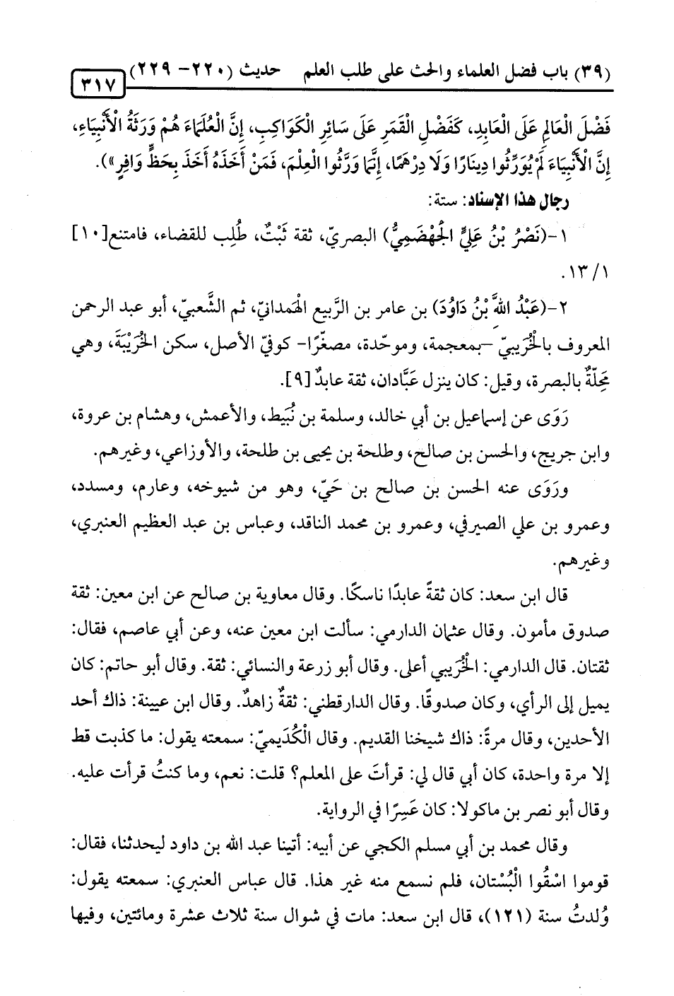 1 - (نَصْرُ بْنُ عَلي الجَهْضَمِيُّ) البصريّ، ثقة ثَبْتٌ، طُلِب للقضاء، فامتنع [10]، 1/ 13.