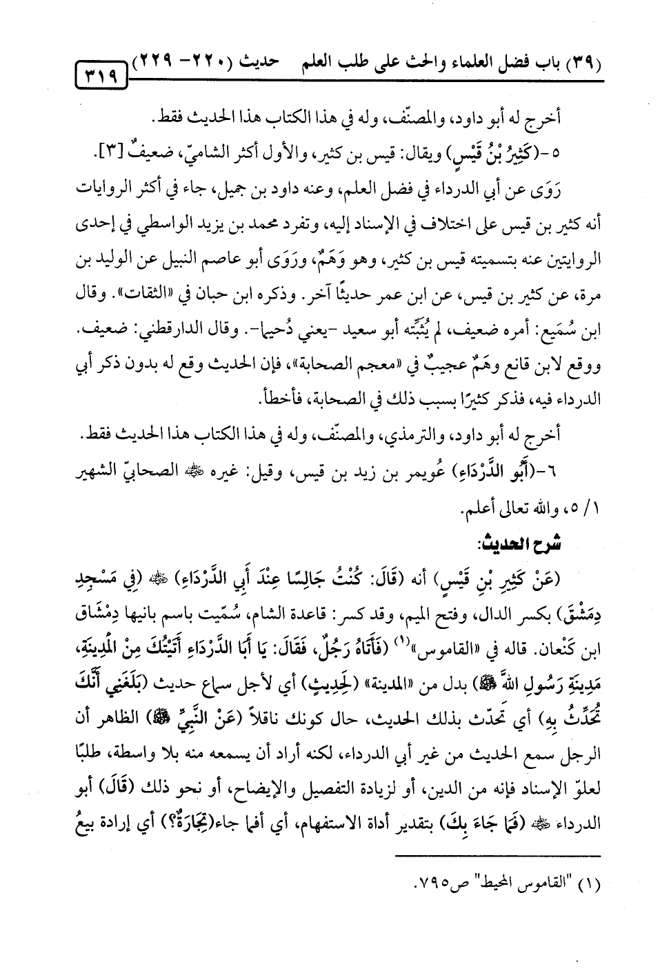 (عَنْ كَثِيرِ بْنِ قَيْسٍ) أنه (قَالَ: كنْتُ جَالِسًا عِنْدَ أَبِي الدَّرْدَاءِ) -رضي الله عنه- (في مَسْجِدِ دِمَشْقَ) بكسر الدال، وفتح الميم، وقد كسر: قاعدة الشام، سُمّيت باسم بانيها دِمْشَاق ابن كَنْعان. قاله في "القاموس" (¬1) (فَأتاهُ رَجُلٌ، فَقَالَ: يَا أَبا الدَّرْدَاءِ أتيْتُكَ مِنْ المدِينَةِ، مَدِينةِ رَسُولِ الله -صلى الله عليه وسلم-) بدل من "المدينة" (لحِدِيثٍ) أي لأجل سماع حديث (بَلَغَني أنكَ تُحَدِّثُ بِهِ) أي تحدّث بذلك الحديث، حال كونك ناقلًا (عَنْ النَّبِيّ -صلى الله عليه وسلم-) الظاهر أن الرجل سمع الحديث من غير أبي الدرداء، لكنه أراد أن يسمعه منه بلا واسطة، طلبًا لعلوّ الإسناد فإنه من الدين، أو لزيادة التفصيل والإيضاح، أو نحو ذلك (قَالَ) أبو الدرداء -رضي الله عنه- (فما جَاءَ بِكَ) بتقدير أداة الاستفهام، أي أفما جاء (تِجَارَةٌ؟) أي إرادة بيعُ