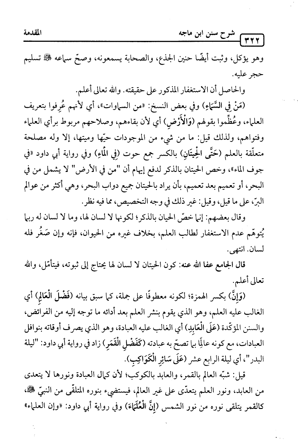 قيل: شبّه العالم بالقمر، والعابد بالكوكب؛ لأن كمال العبادة ونورها لا يتعدى من العابد، ونور العلم يتعدّى على غير العالم، فيستضيء بنوره المتلقّى من النبيّ -صلى الله عليه وسلم-، كالقمر يتلقى نوره من نور الشمس (إِنَّ العُلماءَ) وفي رواية أبي داود: "وإن العلماء"